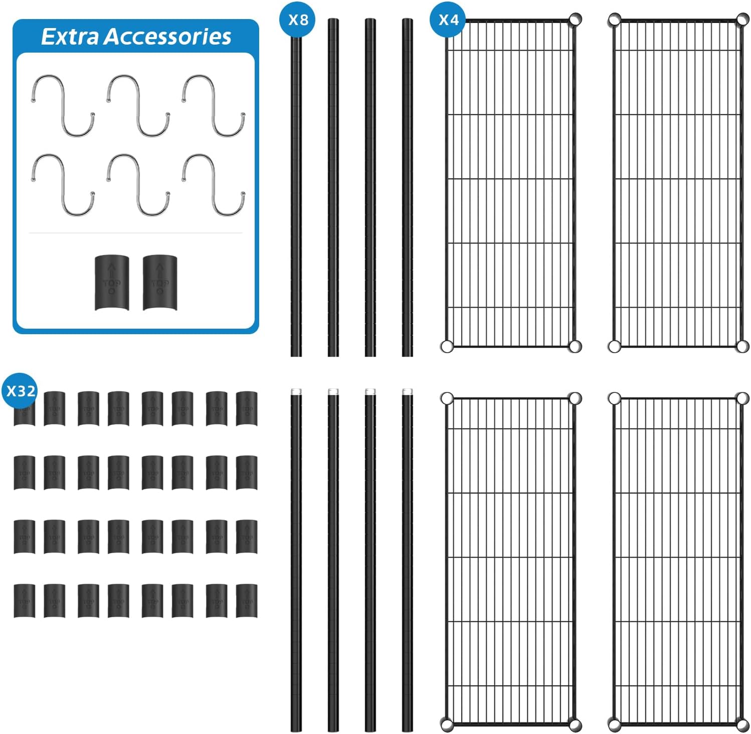 • What You Will Get: This Wire Shelving include: 4 pieces of Metal Mesh Board, 4 pcs Upper Pole,4 pcs Bottom Pole, 32 pcs Clips; Additionally, an additional 2 clips and 6 metal hooks are included