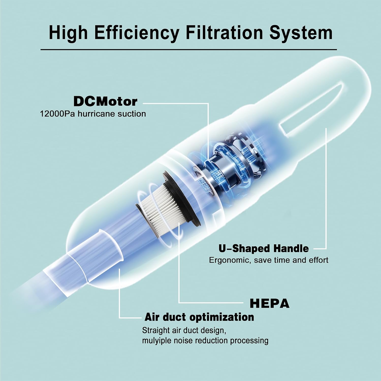 • STRONG SUCTION CORDLESS VACUUM CLEANER:The newly designed cordless vacuum cleaner uses a 100W high-power motor,which can provide maximum suction power.The handheld vacuum cleaner has two suction modes that can be freely switched,with a low suction power of 4Kpa and a high suction power of up to 12Kpa