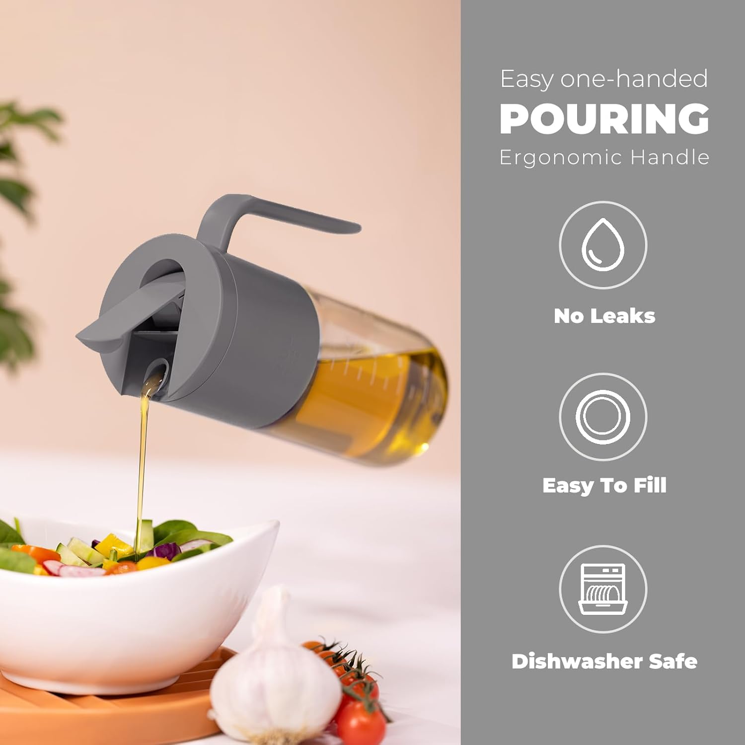 • Auto Flip Lid – One-Hand Use & No Drips:Equipped with a smart auto flip cap, this dispenser opens and closes automatically with a simple tilt—perfect for one-handed use. The leak-proof spout ensures no drips or mess, keeping your countertop clean. It also helps keep oil fresh by sealing out air and dust when not in use.
