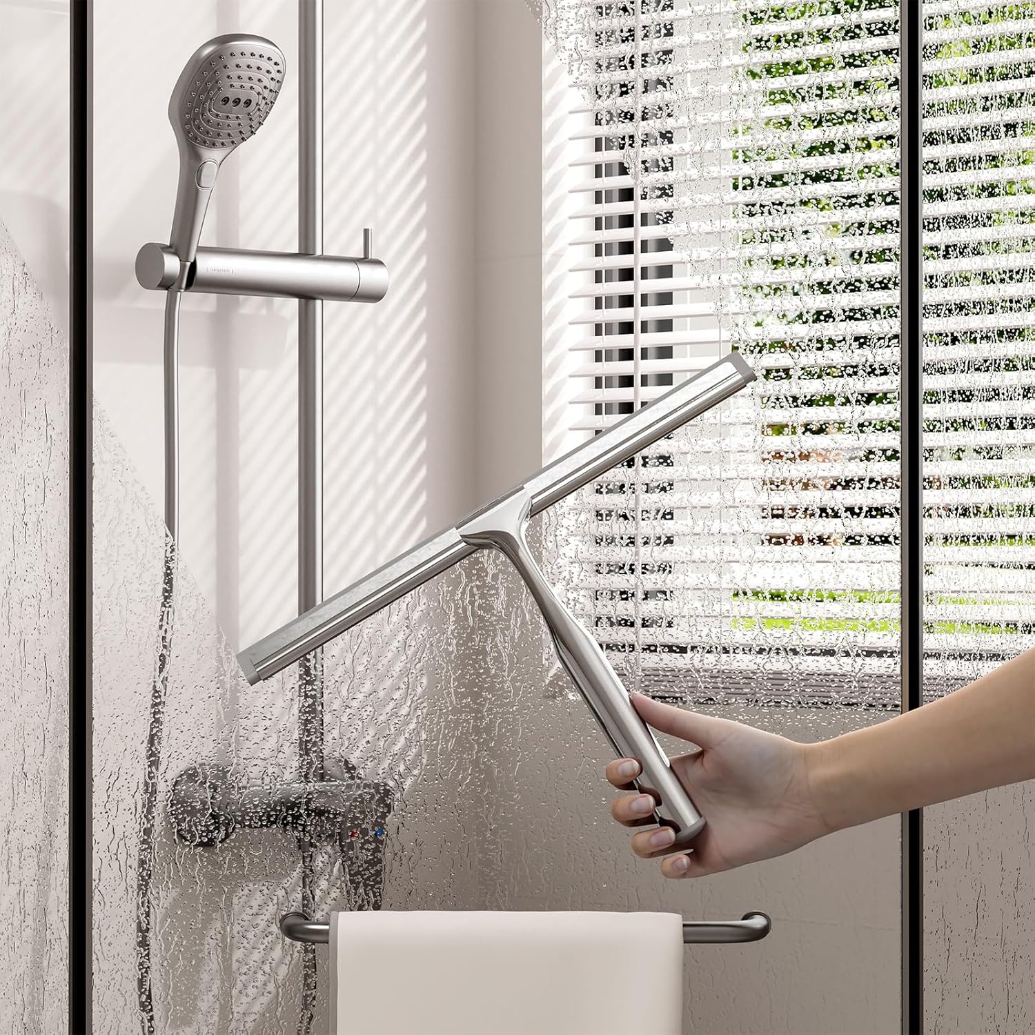 • Shower Squeegee for Glass Doors: Ergonomic shower squeegee with curved edge for efficient water removal from glass surfaces