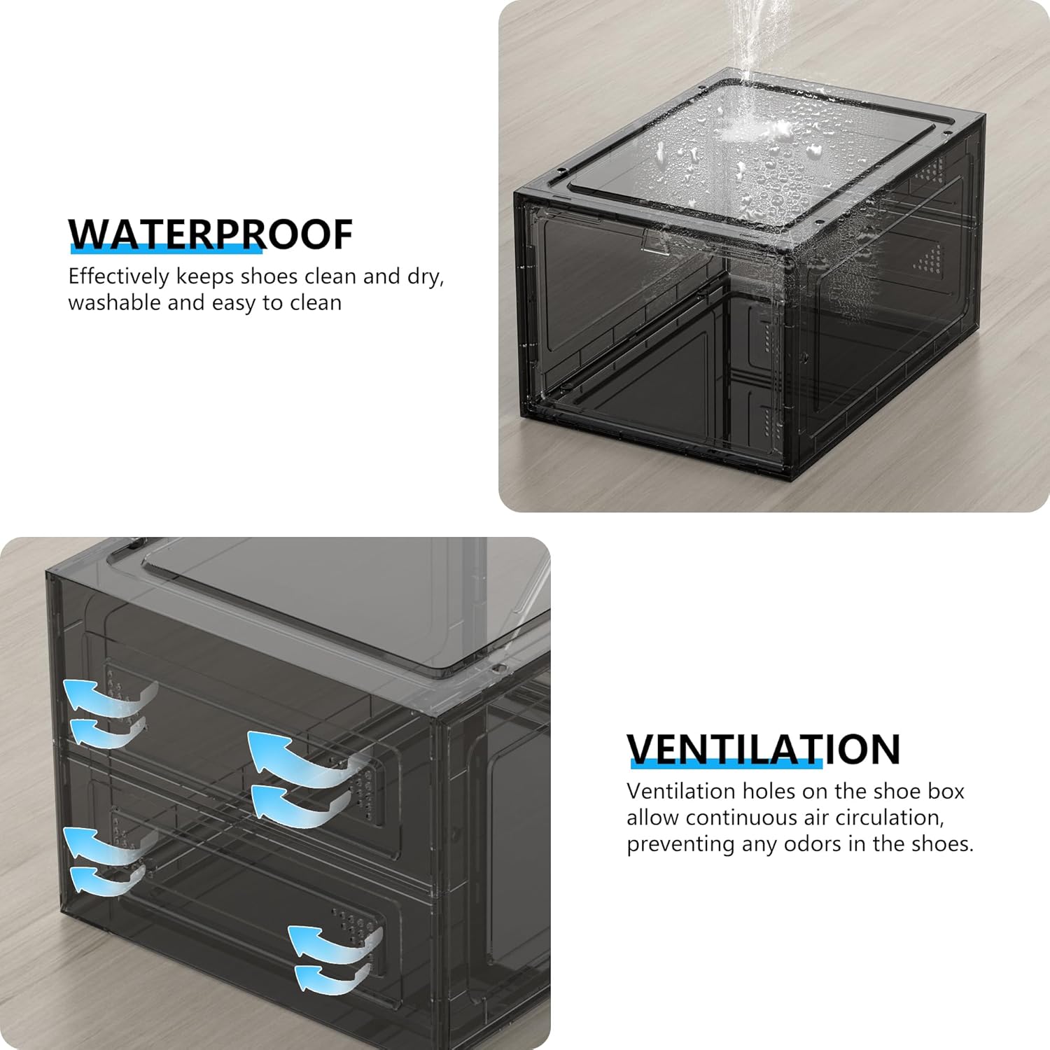 • More Than Just Shoe Boxes:With dimensions of 13.4x9.85x7.6 inches, our storage boxes offer spacious interiors perfect for organizing various types of shoes, from sneakers to high heels and beyond. They also serve as organizers for women's bags, cosmetics, wallets, towels, toys, transforming cluttered spaces into tidy closets and countertops!
