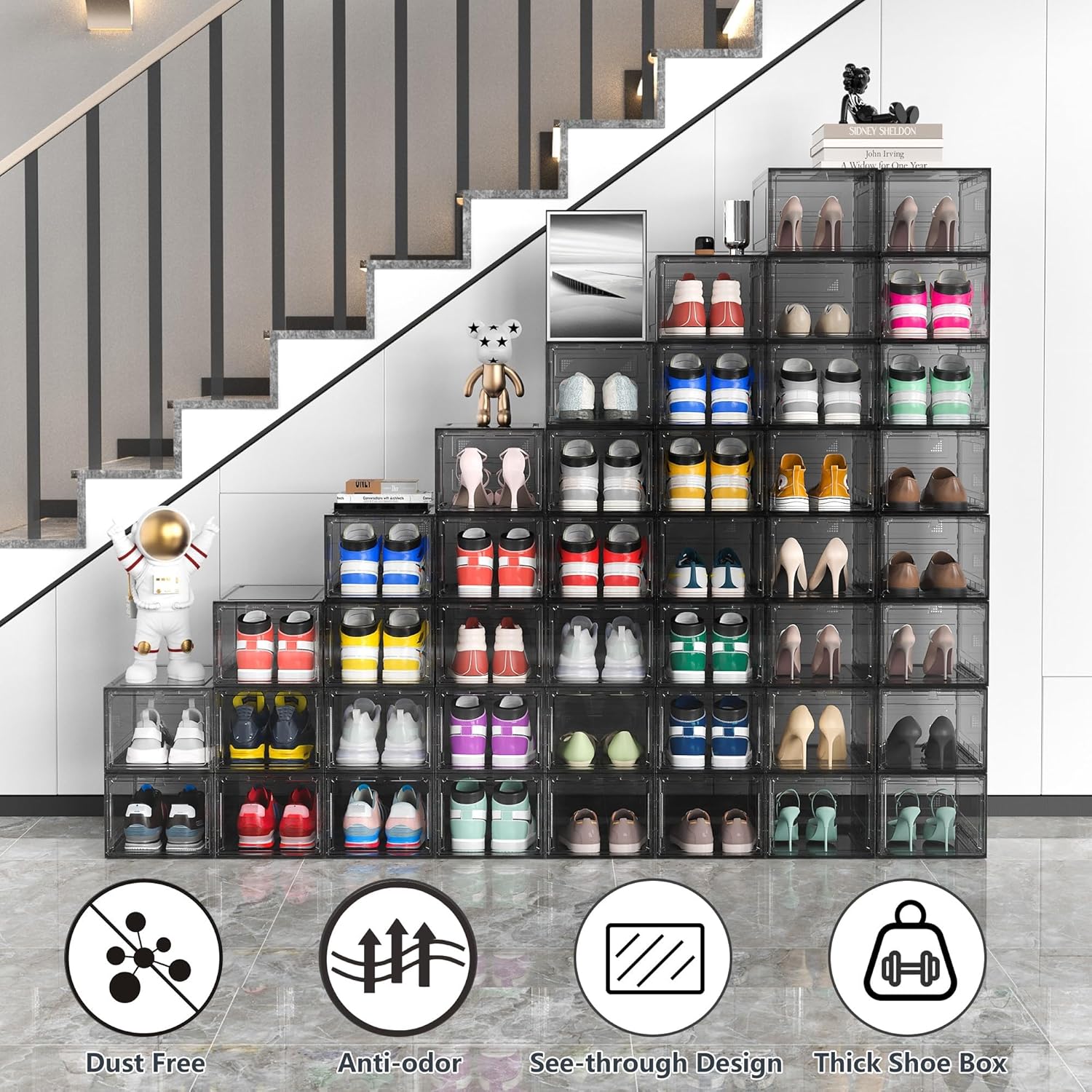 • Upgraded Hard Shoe Boxes:Say goodbye to soft plastic shoe boxes! Made of from sturdy hard plastic on all six sides, our shoe boxes boast exceptional durability and load-bearing capacity. Additionally, their transparent design ensures easy viewing of your shoes.