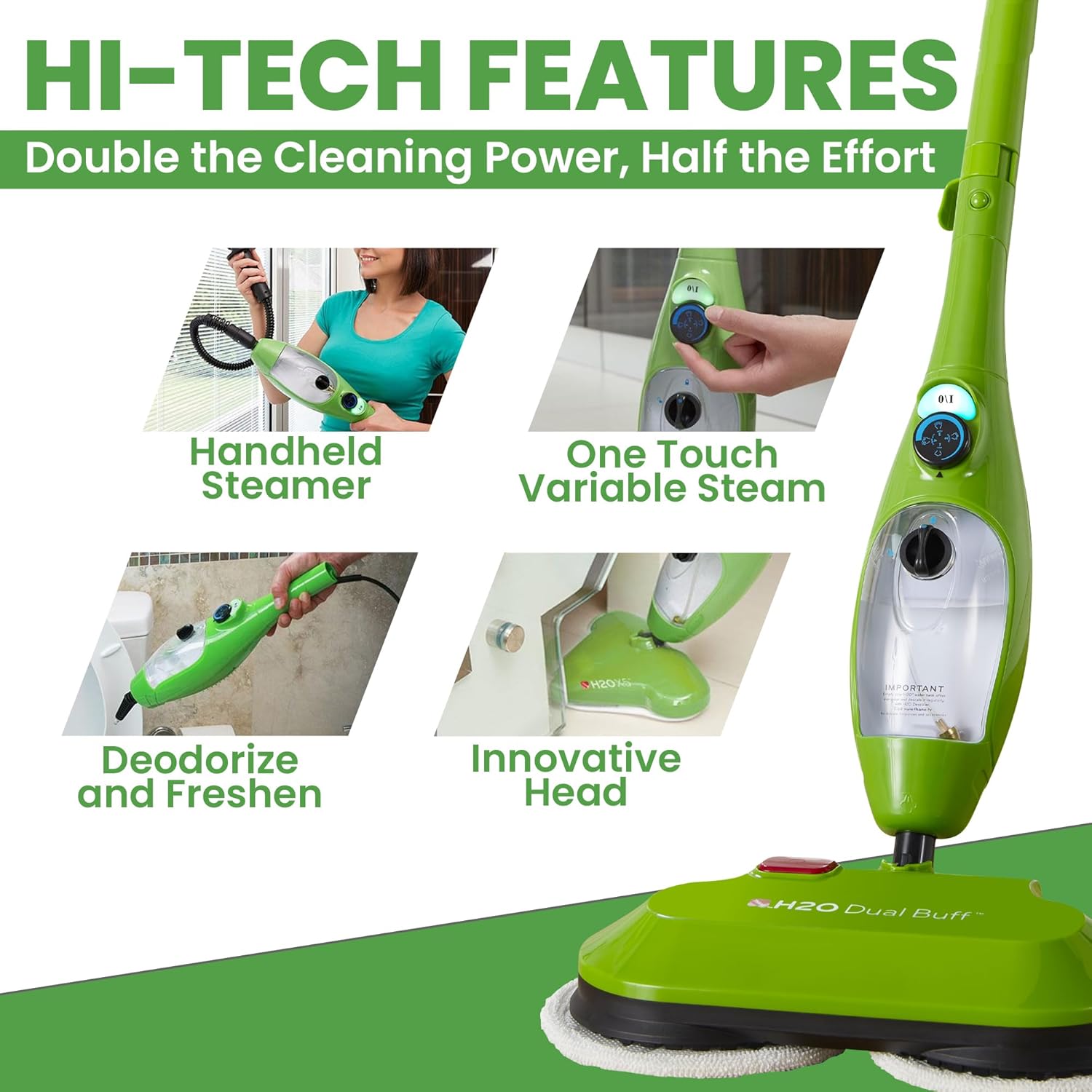 H2O X5 Dual Buff Steam Mop, 8 in 1 Handheld Steam Cleaner For Kitchen Tile Floors, Hardwood Floors, Grout Cleaner, Upholstery Cleaner and Carpets, 2 washable scrub pads, 11 cleaning accessories
