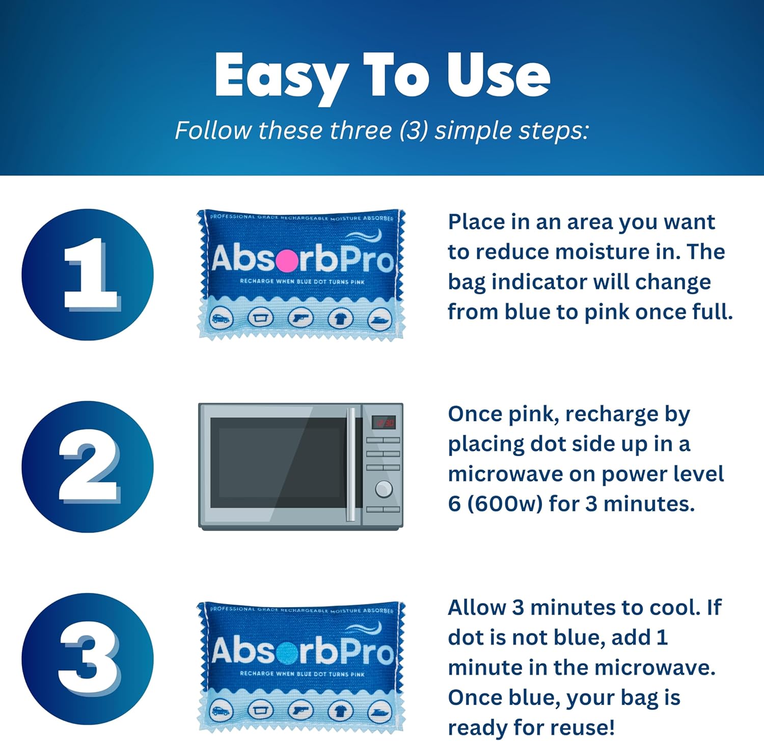 • Recharge Effortlessly: When the indicator changes from blue to pink, place it dot side up in a microwave at power level 6 for 3 minutes. It’s as good as new!