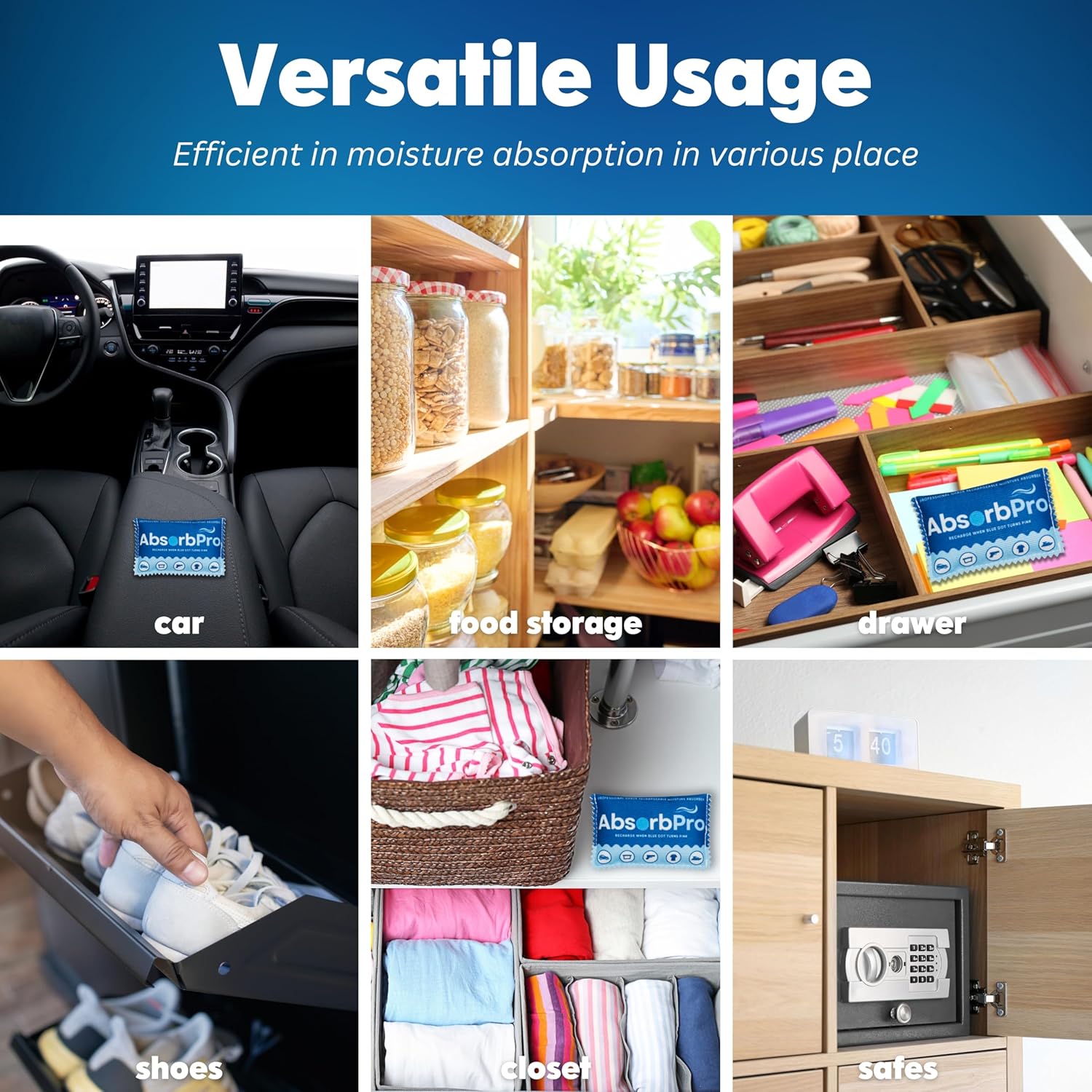• Versatile Usage: Our reusable moisture absorbers are versatile, ideal for gun safes, car moisture, food storage, shoes, trucks, boats, storage bins, and any space where you store valuables.