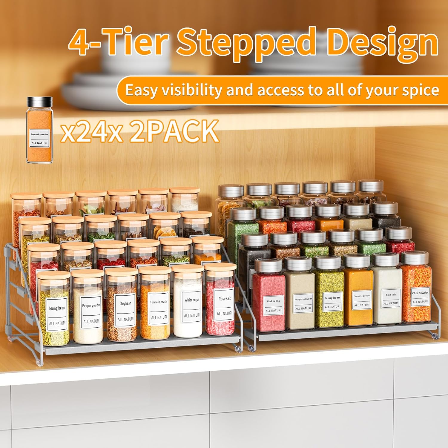 RCHYFEED 4 Tier Spice Rack Organizer, Spice Organization for Cabinet,Pantry, Countertop,Tiered Spice Rack Easy Visibility,Depth Expandable Seasoning Shelf for Kitchen Cabinet Organizer,Silver,2 PACK