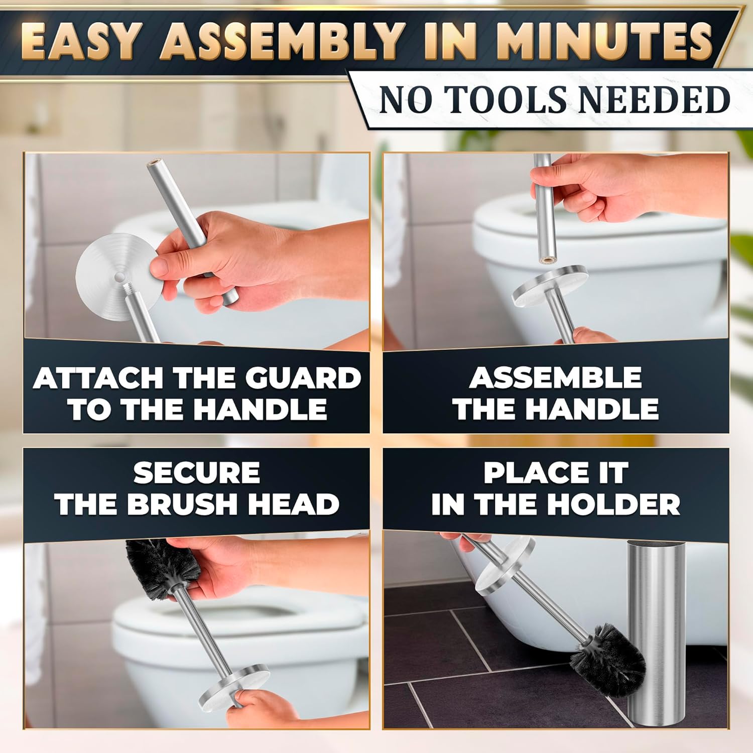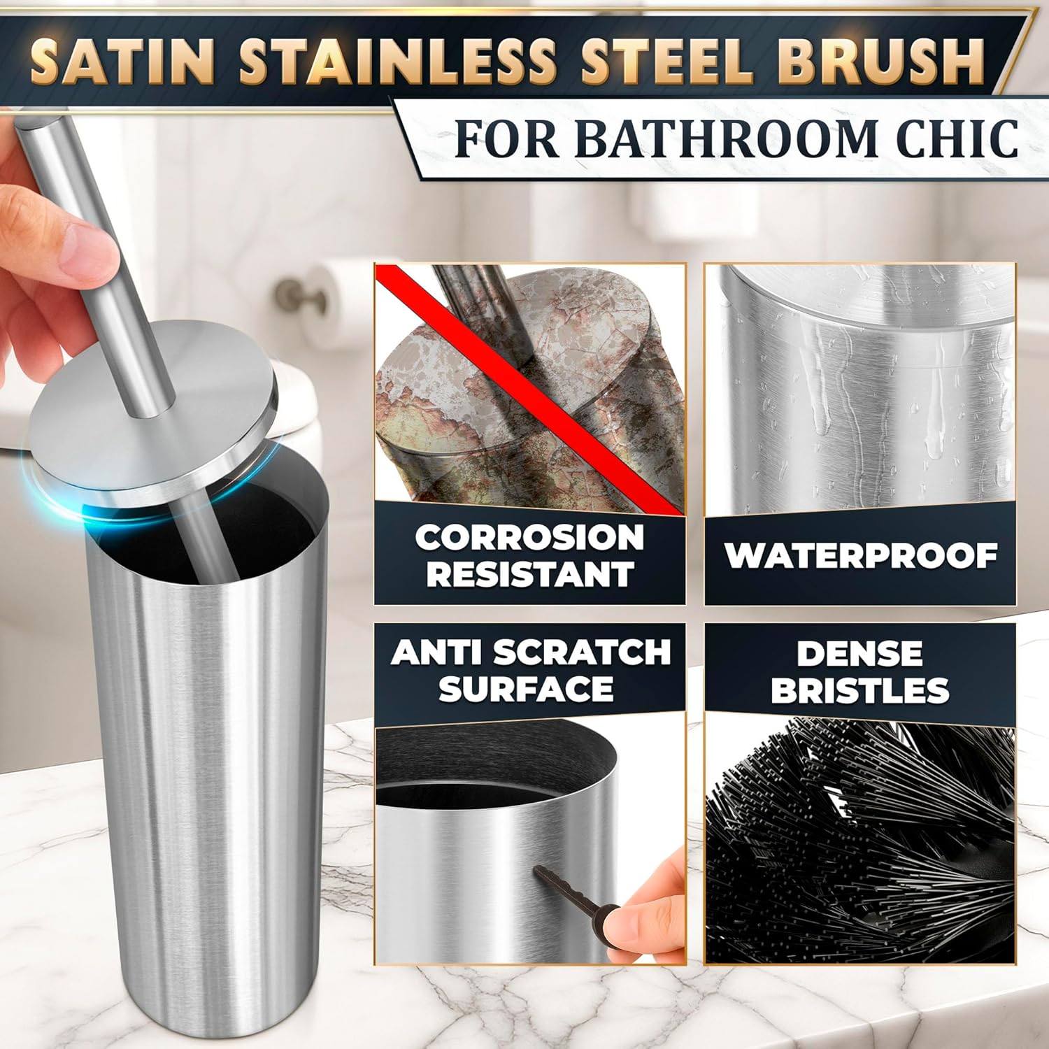• Anti-Splash Bathroom Toilet Cleaner Brush: Our toilet brush and holder set stainless steel features a protective cover on the handle that shields your hands from splashes for a hygienic cleaning