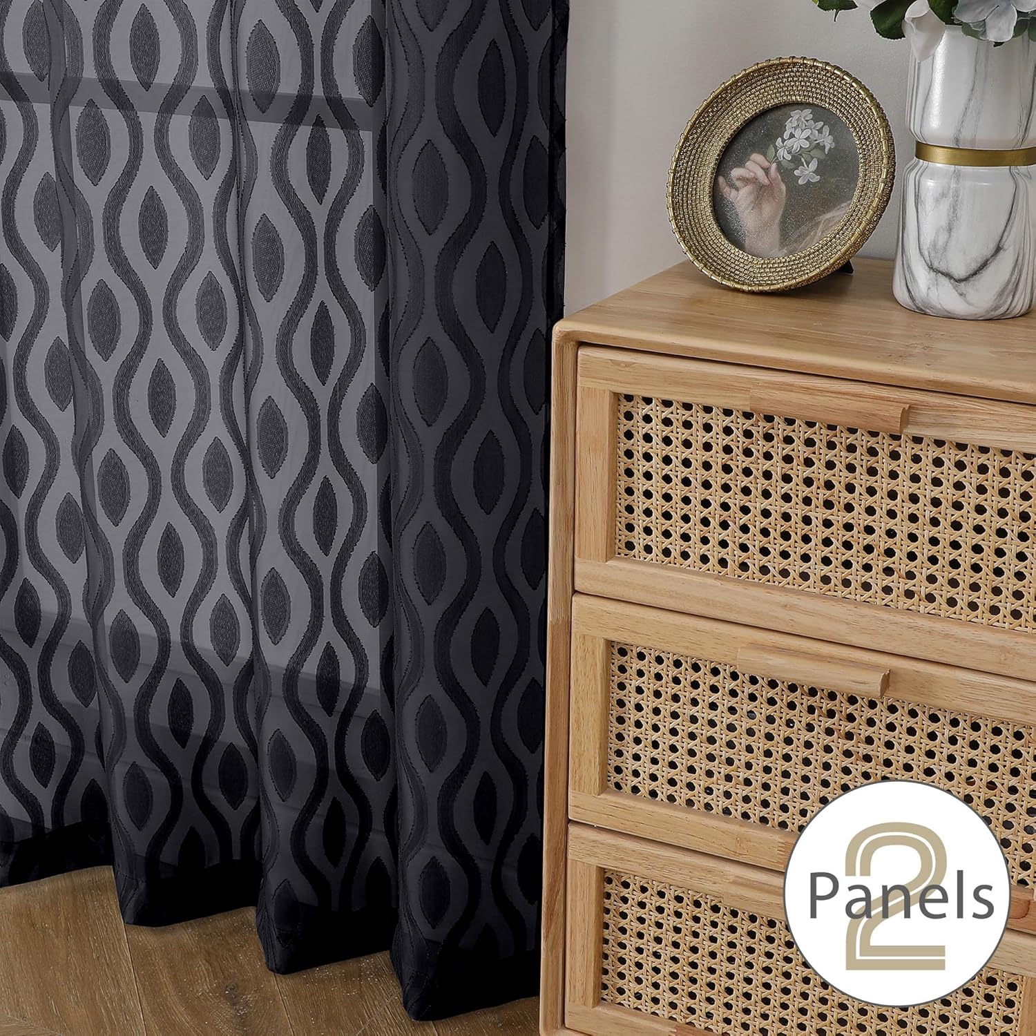 Aiyufeng Extra Long Sheer Curtains 96 Inches Long for Bedroom 2 Panels Set, Farmhouse Black Wavy Line Light Filtering Clip Jacquard Solid Voile Living Room Curtains, Dual Rod Pocket, 40"Wx96"L Inches