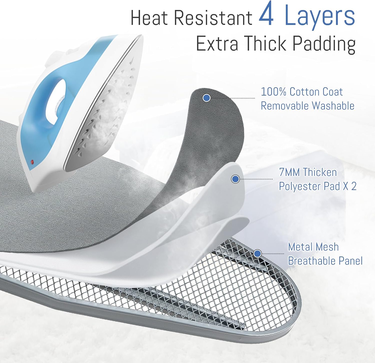 • Iron Board Cover with Padding: The silver ironing board cover is made of 100% cotton; It's removable, washable, and reusable, and it comes with 2 layers of 7 mm thick pads made of fireproof fabric; The extra thick cloth cover ensures you an extraordinary ironing experience