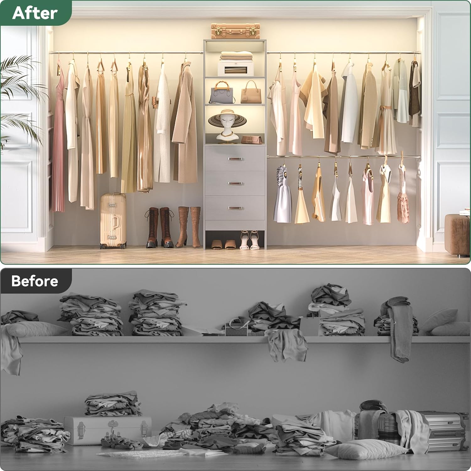 • About Organization and Capacity - This 8ft closet has 3 adjustable hanging rods, so you can hang the cloth on the hanging rods and you can also put clothes on the shelves too. It is a 500+ LBS and 150pcs clothes capacity closet organizer system.