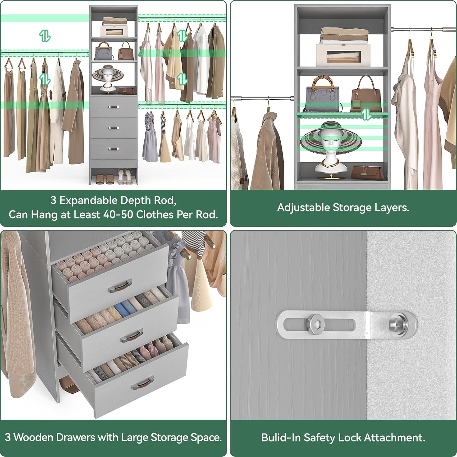 96'' Closet Organizer System with 3 Hanging Rods (Without 3 Storage Shelves), 8FT Closet Systems, Wall Mount Bedroom Wardrobe with 3 Wood Drawers, Adjustable Garment Rack from 5 to 8FT, Grey