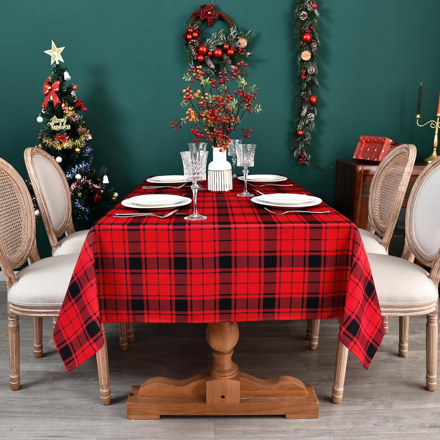 Gingham Xmas Tablecloth Fabric - Oblong 58x120 Water Resistant Christmas Plaid Table Cloth for Indoor/Outdoor Use - Red Tabletop Cover Perfect for Birthday, Picnics, Gardens