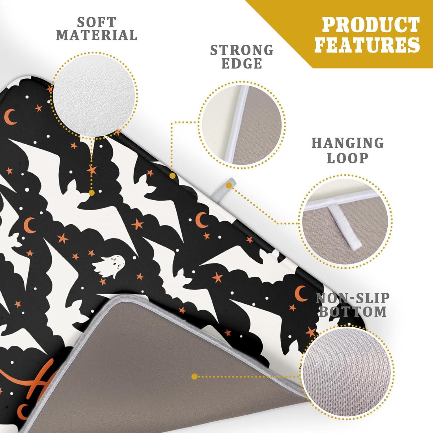 • 【Dish drying mat】The halloween kitchen mat is 16x18inch/18x24inch, which is suitable for most homes and kitchen countertops while providing a smart and sharp look. Our dish drying mat is soft and durable, can be used as a drying mat, put down all sizes of kitchen tableware, also can be used as a protective pad, dish mat, cup mat, heat insulation pad for countertop for heat insulation and ironing, which can perfect hold your dishes, plates, big pots and pans.