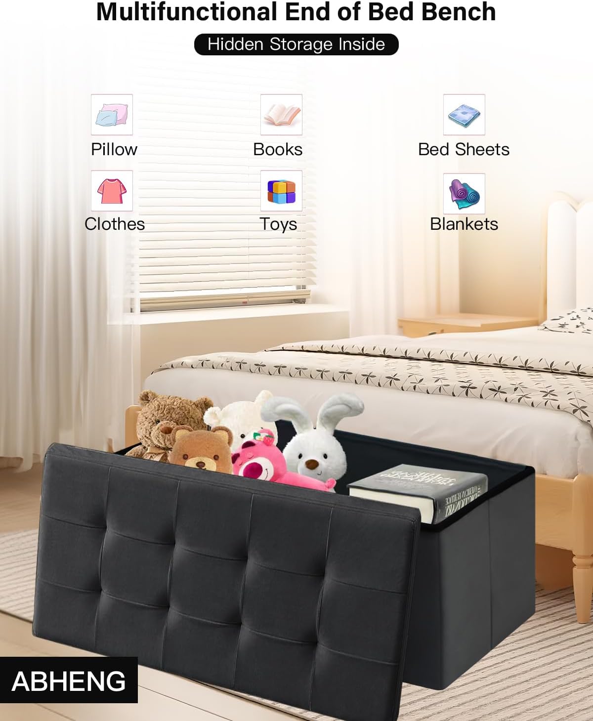 • ABUNDANT CAPACITY: Boasting a capacious 35-gallon (131 L) storage compartment and sized at 15"D x 43"W x 15"H (38 x 110 x 38 cm), the Storage Ottoman is perfect for neatly stashing away blankets, clothes, pillows, bed sheets, and books. Keep your living space clutter-free and organized with this storage wonder.