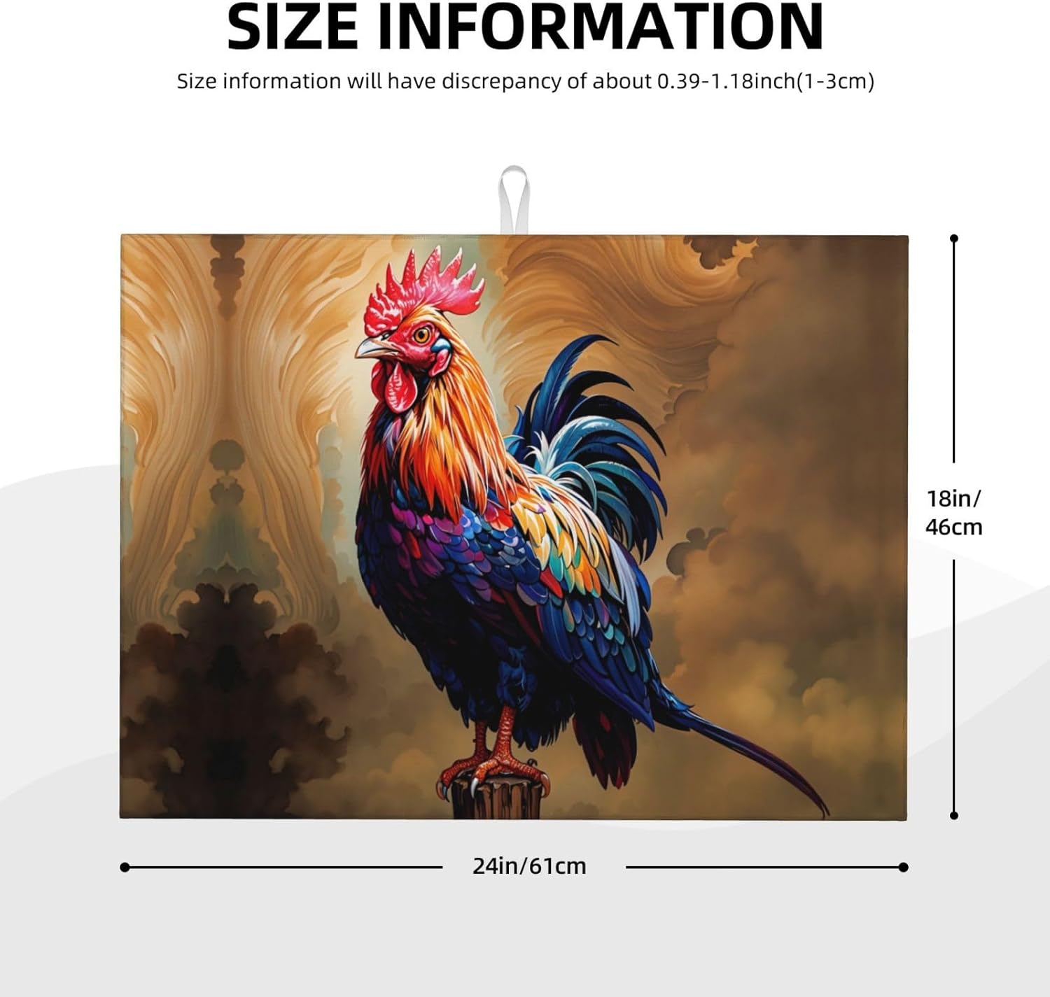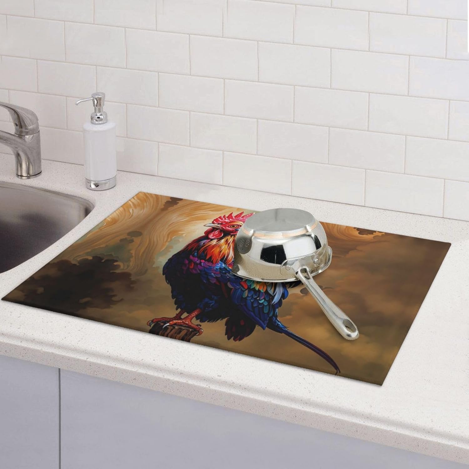 Rooster Dish Drying Mat Highly Absorbent Double-Sided Microfiber with Hanging Loop Reversible Drain Dish Rack Mat Drain Mat Suitable for Kitchen Countertop Coffee Bar 18 x 24 Inch