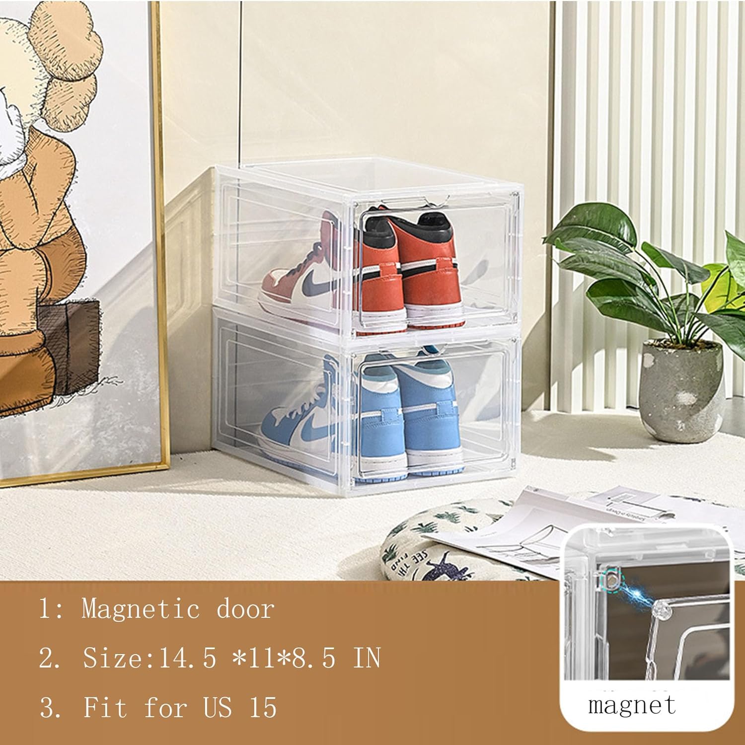 XXL Drop Front Shoe Storage Box Stackable, 6 Pack Shoe Display Case Fit US 15,Sneaker Storage Shoe Containers with Magnetic Door(6 PACK CLEAR)