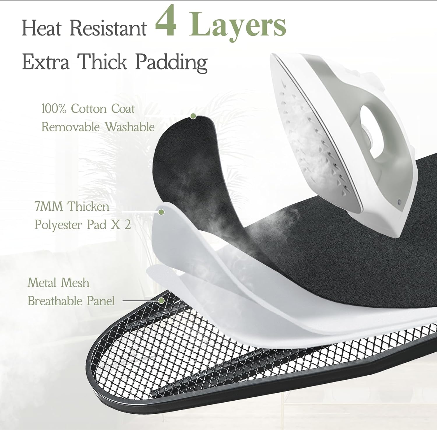 • Iron Board Cover: Heat-resistant ironing board cover with an ultra-thick, 2-layer cotton padding absorbs heat and creates an ideal ironing surface, enhancing the iron’s glide, making the task quicker and easier.