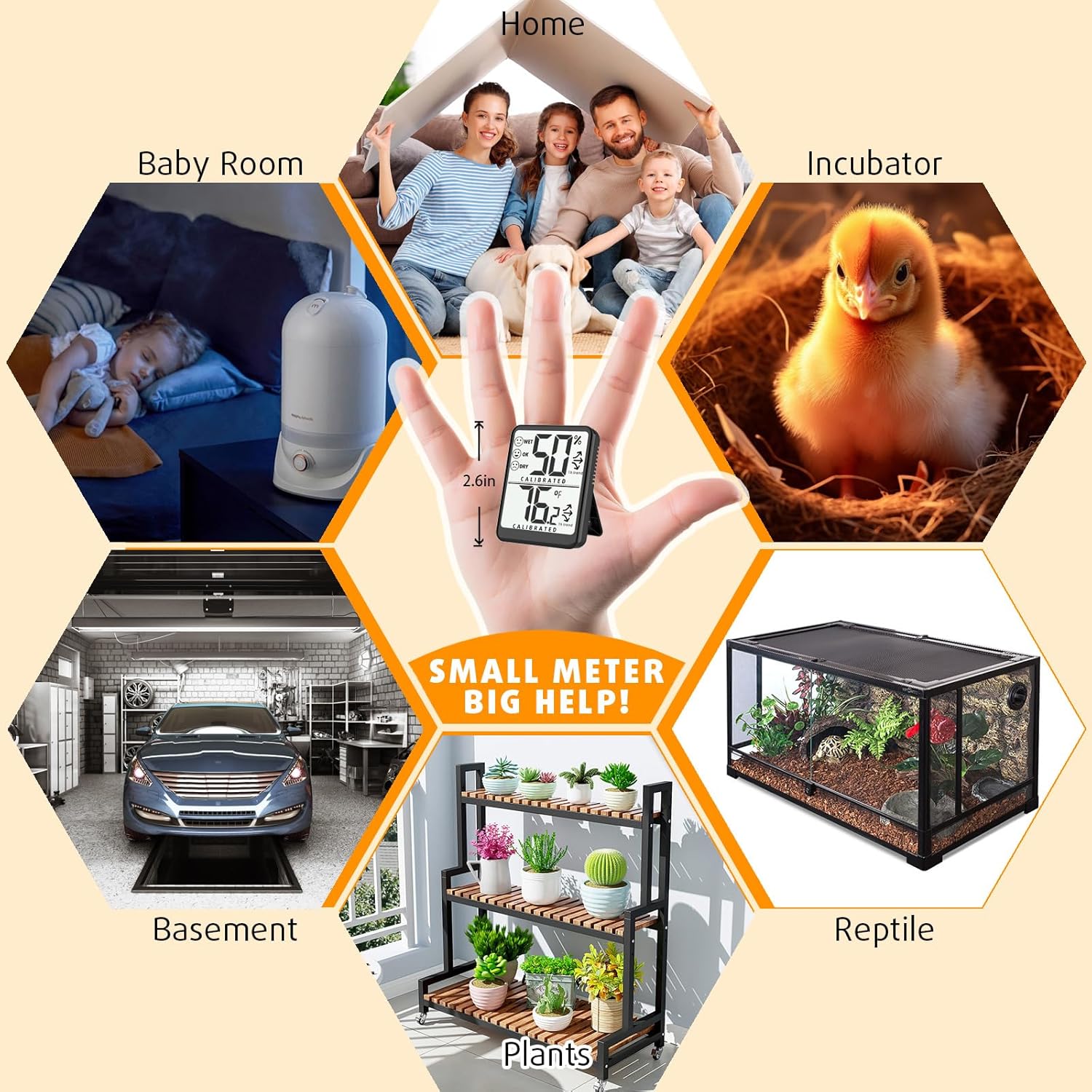 • Compact Design, Space-Saving: This indoor thermometer hygrometer features an adjustable kickstand, easy to carry. It is suitable for bedroom, baby room, greenhouse, plants, incubator, office, garage, car, basement, bathroom, camper, crawlspace, warehouse