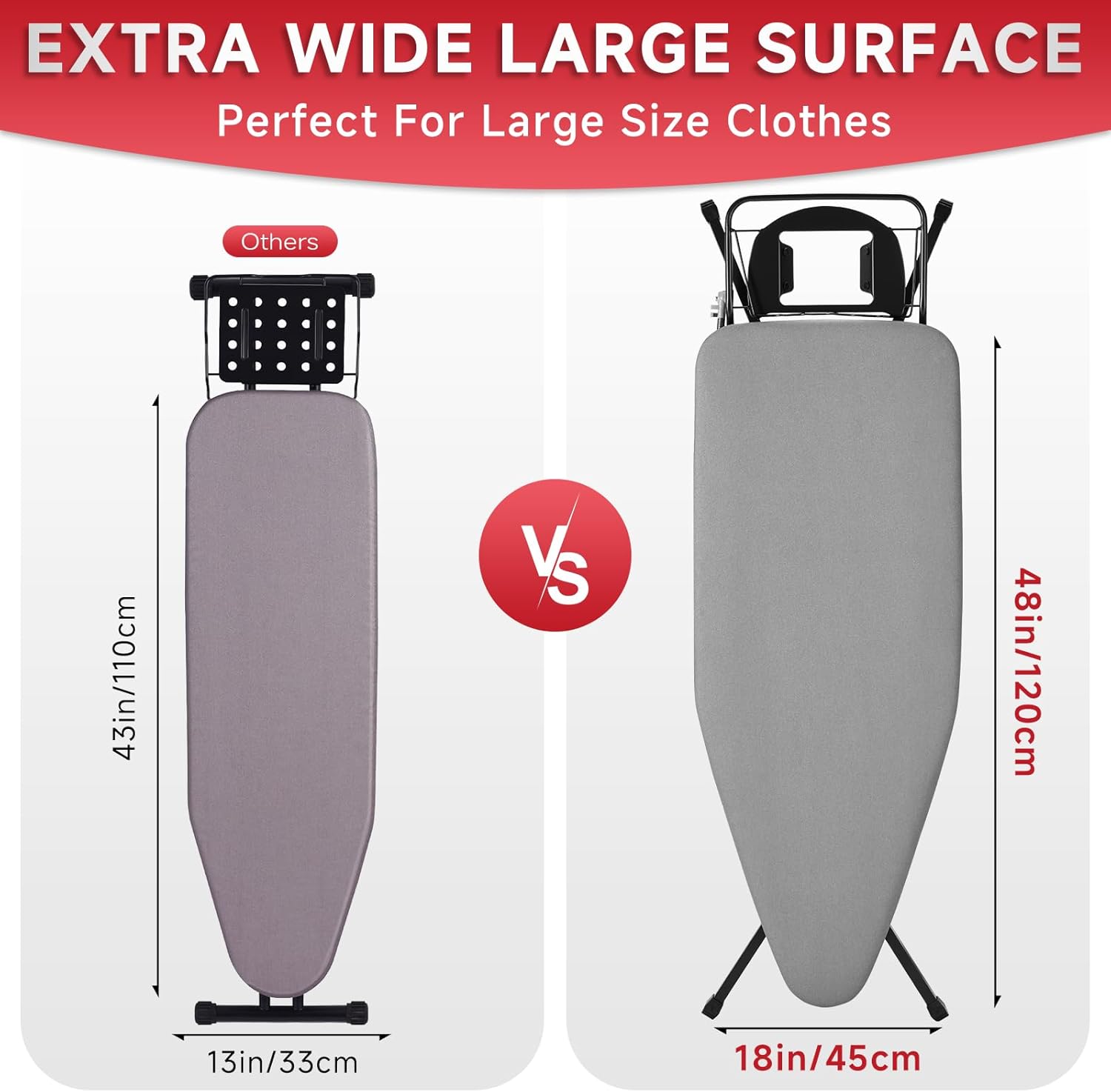 • EXTRA-WIDE IRONING SURFACE: This new ironing board takes ironing efficiency to the next level with an expansive 48" x 18" board (57" x 18" with iron rest), offering a wider workspace for a luxurious and effortless full-size ironing experience.