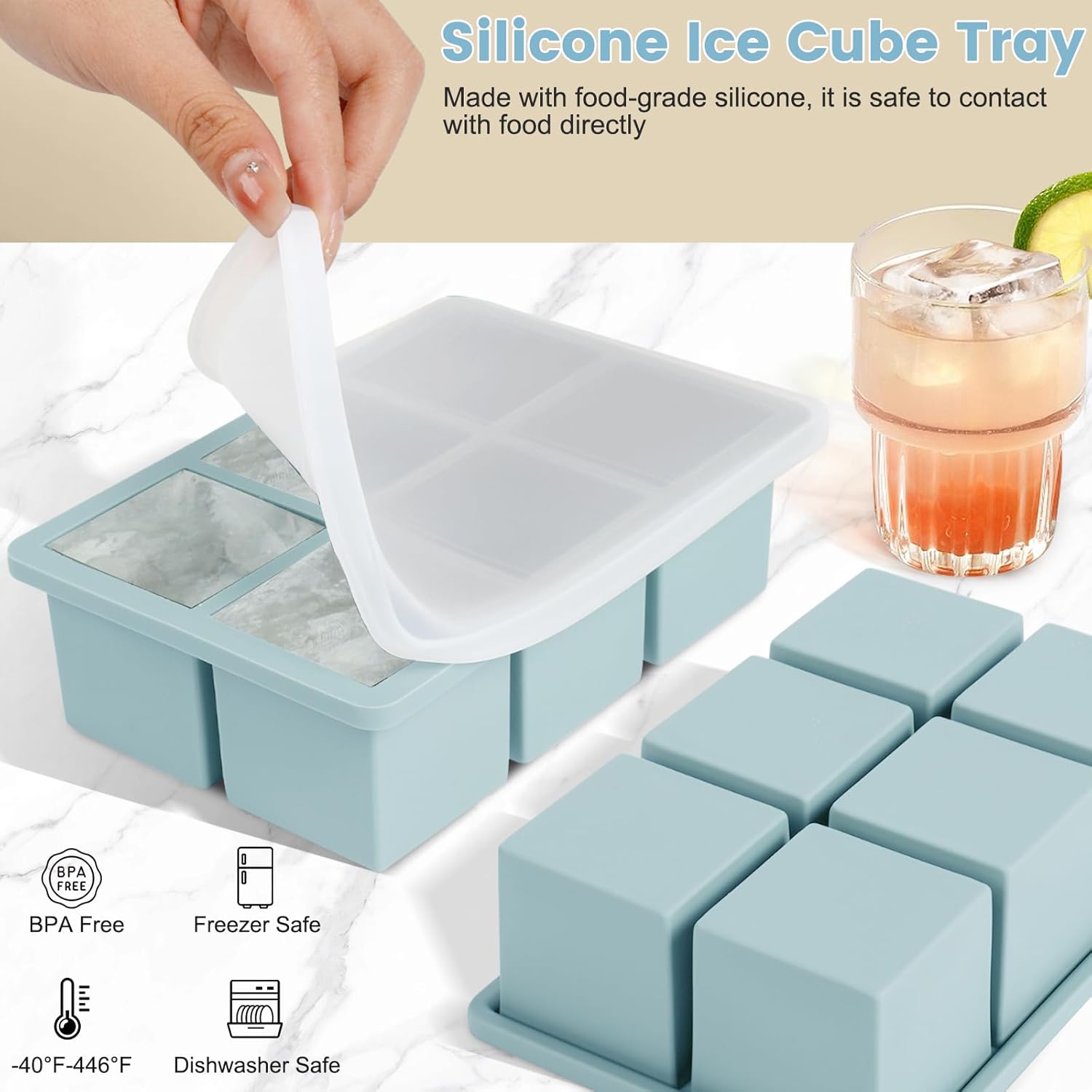 • Easy-Release Large Ice Cube Tray; Designed with independent cavity at the bottom, flexible & non-stick silicone surface, you can get large ice cubes easily. It is dishwasher safe, easy clean