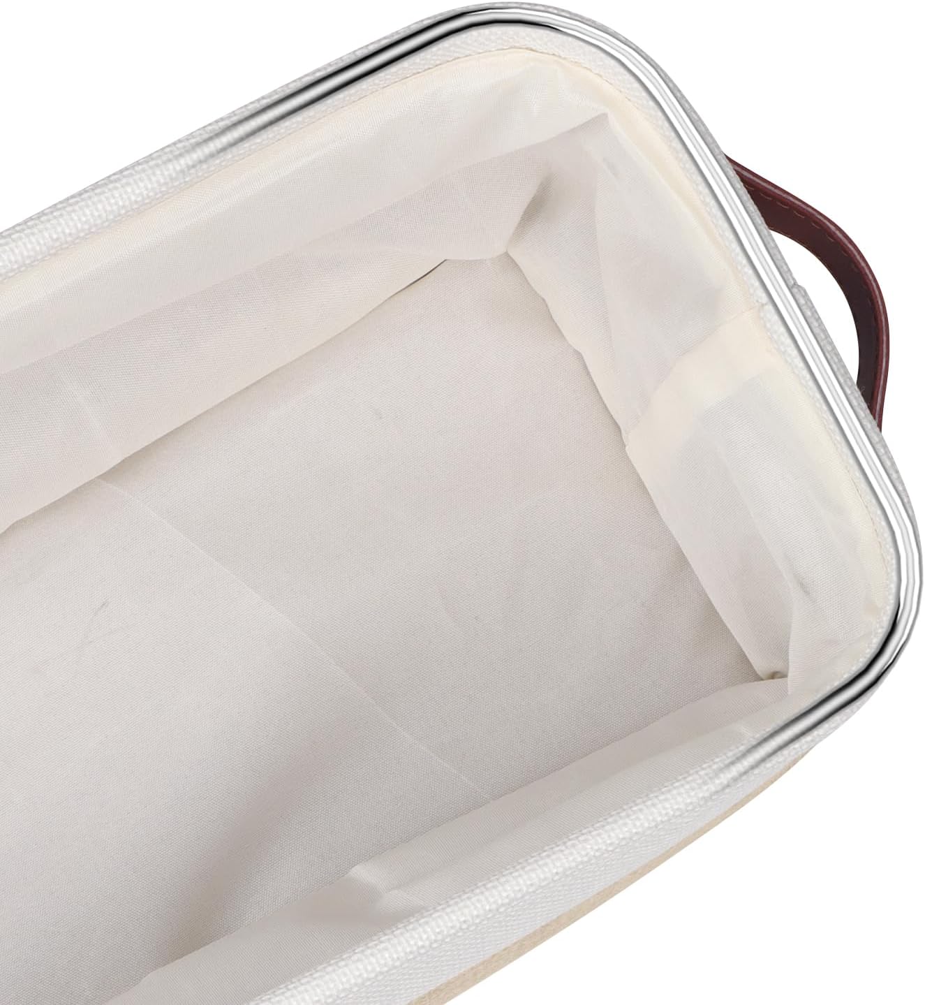 • 【Firmly Upright】 - Sturdy metal support frame and the hard cardboard reinforcement for the bottom.Retain small basket firmly upright.Sides of the handle are reinforced with stitching.The storage basket can easy pull out or in of shelves and closet.