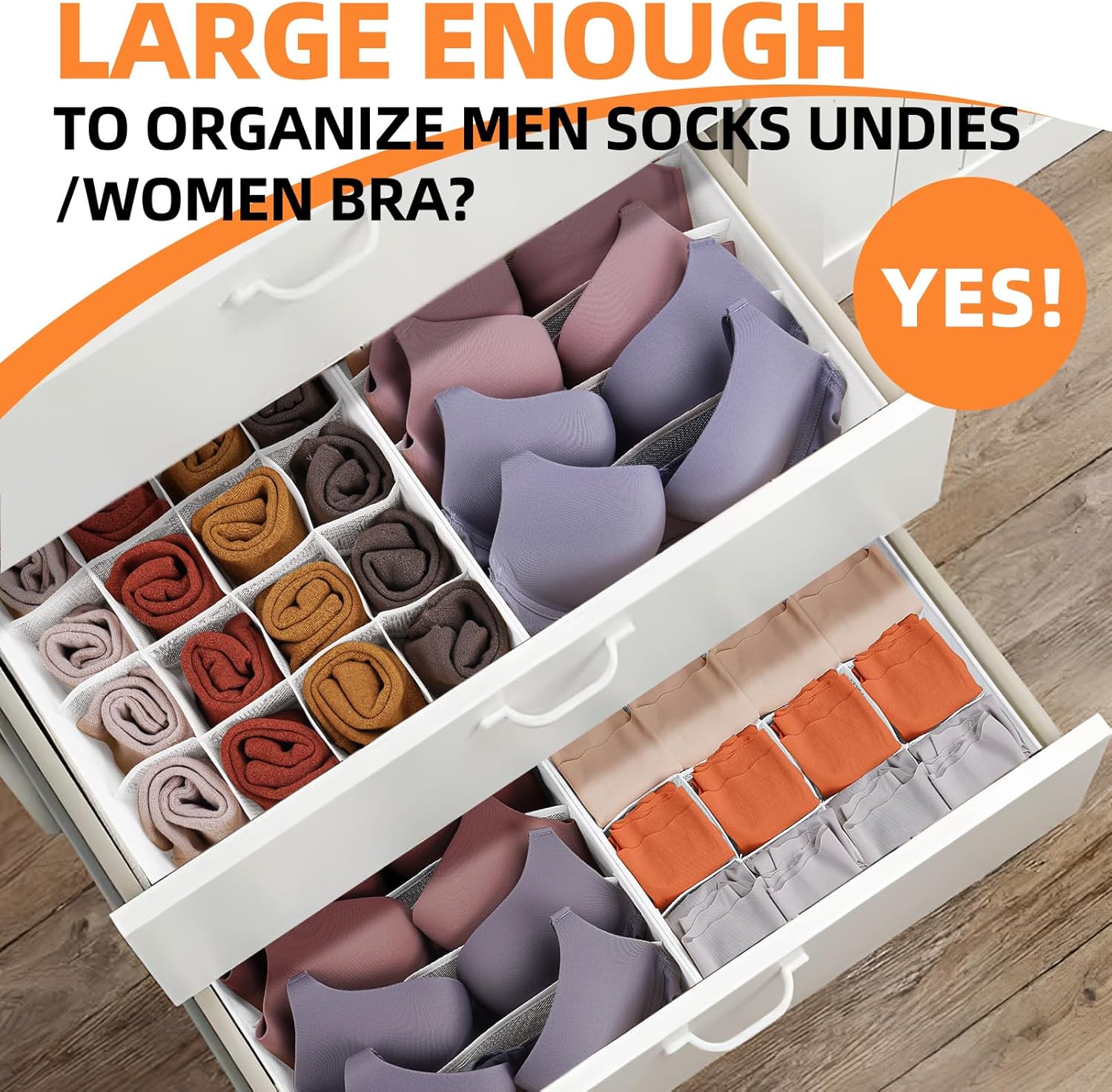 • 【90 LARGE COMPARTMENTS】Unlike other sock organizers with small sections, our clothes organizer features slightly larger compartments in 3 sizes to better accommodate various under-clothes storage and space saving needs. It's perfect for men’s boxers, winter socks, women’s bras up to C cup, yoga leggings, hair accessories, ties, scarves, belts, yarns and even small Christmas ornaments.