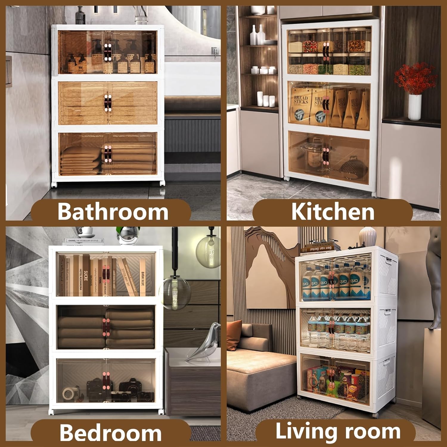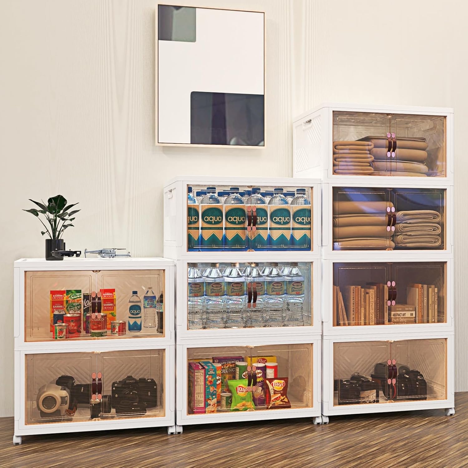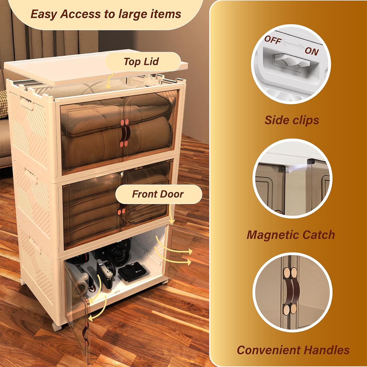 Tansheep Stackable Storage Bins with Lids, Collapsible Plastic Bins for Closets, 78 Quart Organizers with Doors and Wheels, Thicken and Large Cabinet for Home Bedroom(57 Gal, 3Pack)
