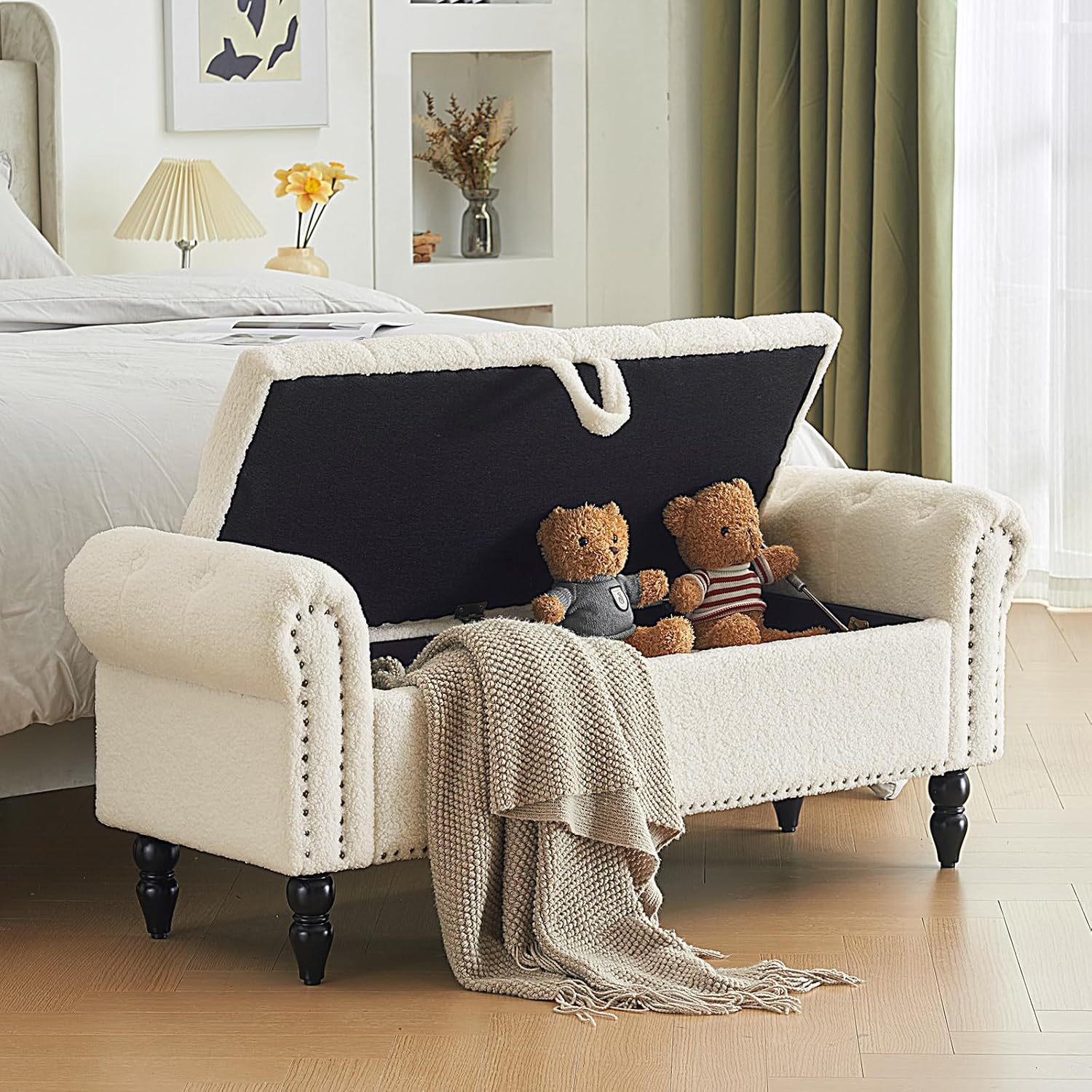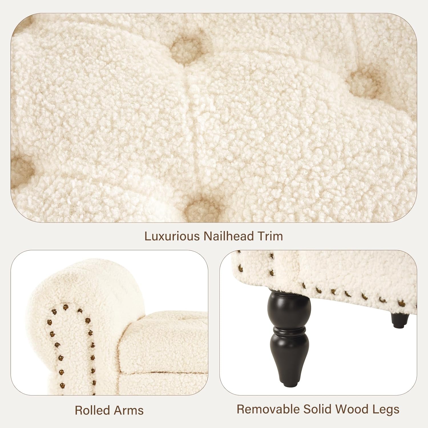 • [Mid-century Modern Bench] -Inspired by modern mid-century design concept, our upholstered bedroom storage bench end of bed features a foam-padded seat with high-quality faux fur. Rolled arms, button tufts and a luxurious nail head trim offer a nice finishing touch.