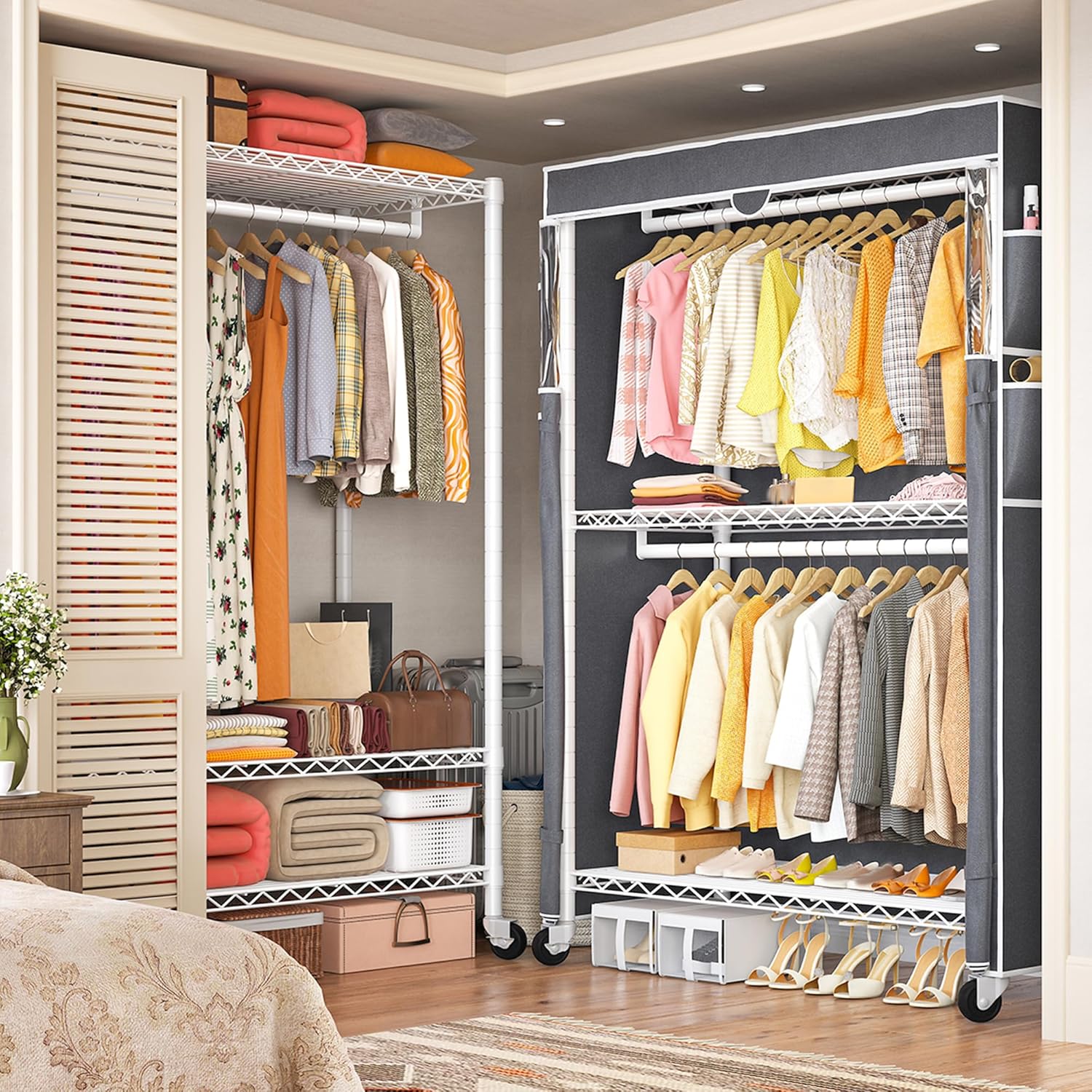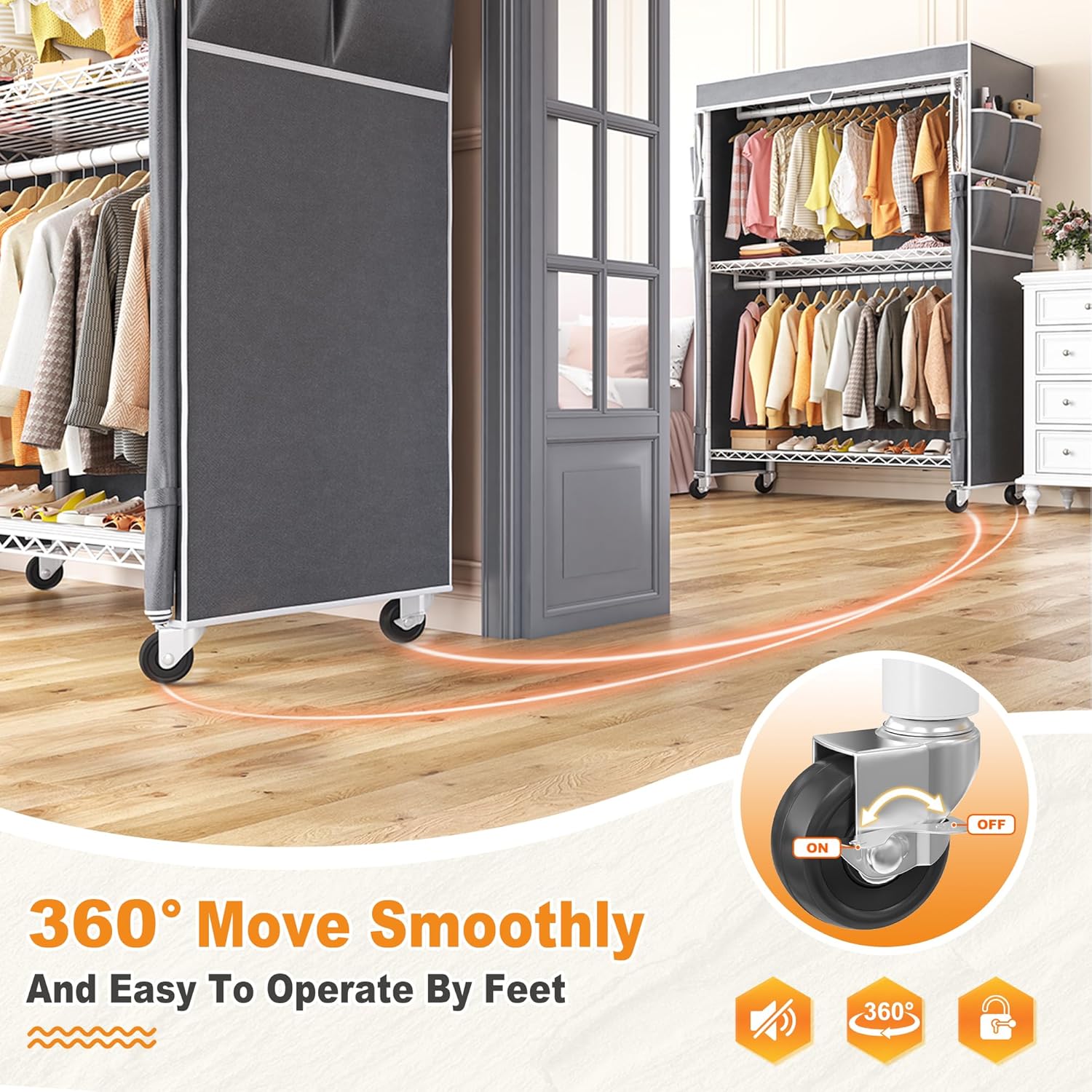• 【Quality Clothing Rack can be Used in Multiple Situation】: The clothes racks are equipped with a window dust cover and two options for supporting feet. When moving this garment rack, you can choose 360° rotating wheels, designed to allow you to roll this garment rack anywhere you need in your home, and two of the wheels are lockable, so you don't have to worry about the clothes rack will run on its own. You can also use adjustable feet to support the clothes rack to meet your various use needs.Stay organized and efficient—great for school, dorm, or home workspace