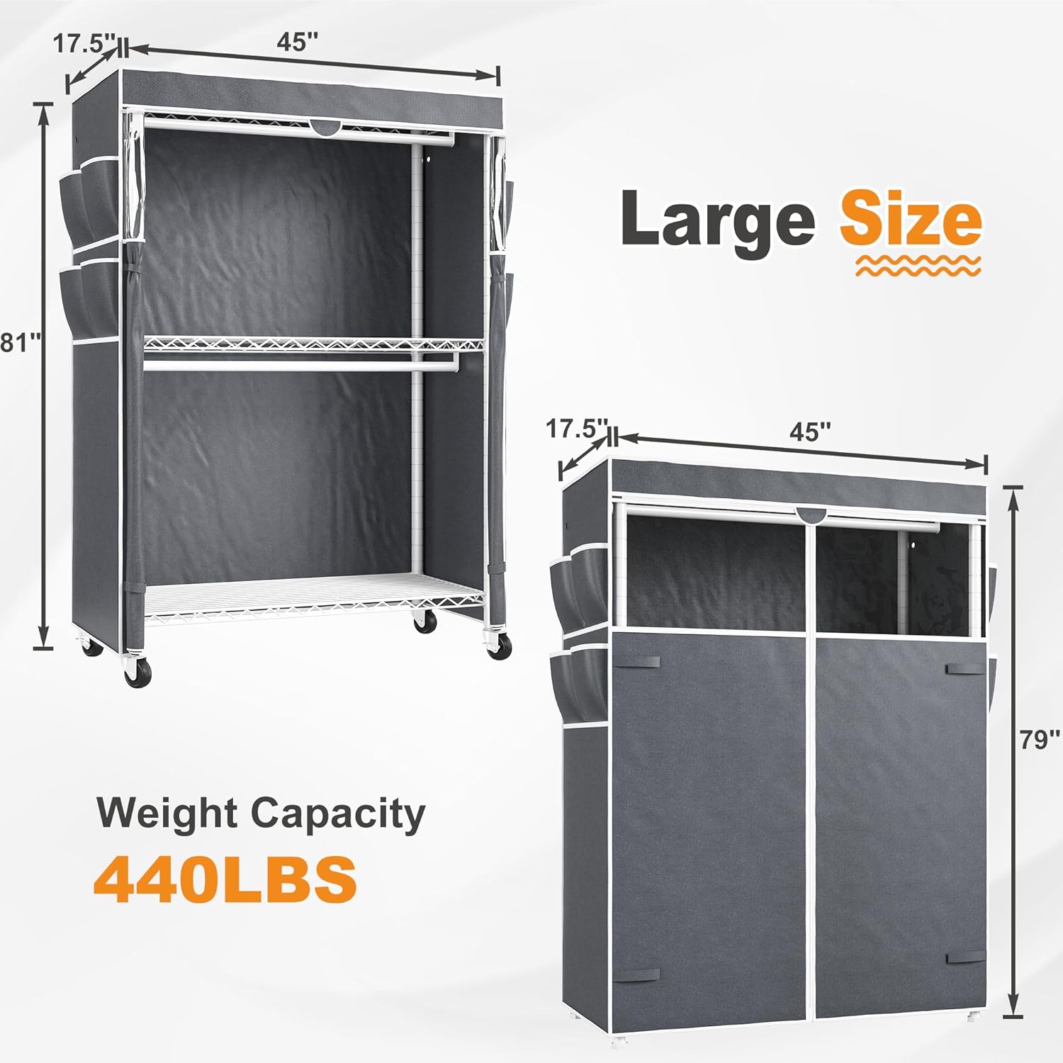 • 【Clothes Rack with Cover 440LBS Bearing Capacity】The clothing rack has 3 shelves and 2 hanging rods, which can hang about 150+ T-shirts clothes or 80+ winter clothes. Single hanging rod can support up to 44 LBS. Raybee heavy duty clothes rack suits different place: bedroom, cloakroom, laundry room, corners. The max load capacity of this clothes rack is 440lbs when stationary, and 176lbs when rolling