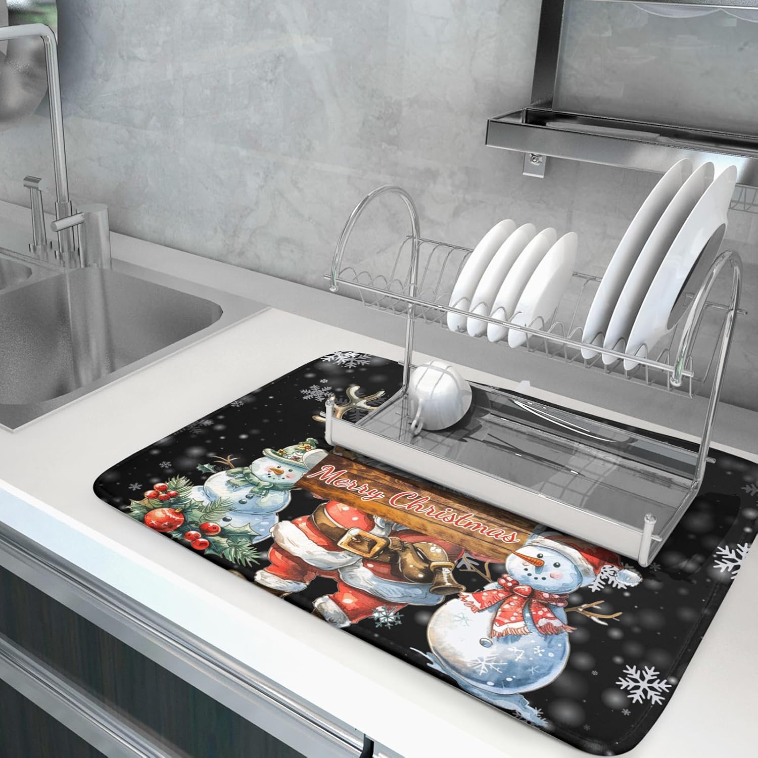 • 【Premium Material】The christmas kitchen dish drying mat is made of high-quality polyester surface material, and the middle is composite sponge material, provides a soft protective cushion. The backing with reversible superfine fiber can absorb water several times heavier than itself, which quickly absorbs water, stops liquids from soaking through, keep the kitchen countertop dry and clean. The dish drying mat can been double-sided uses with strong edging, not easy to disperse.
