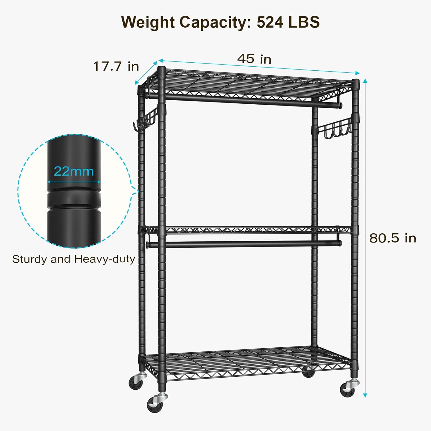 • [Dimension & Load Weight]: 45"W x 17.7"D x 80.5"H(Included wheels height) with 22mm diameter poles, max load 524 pounds