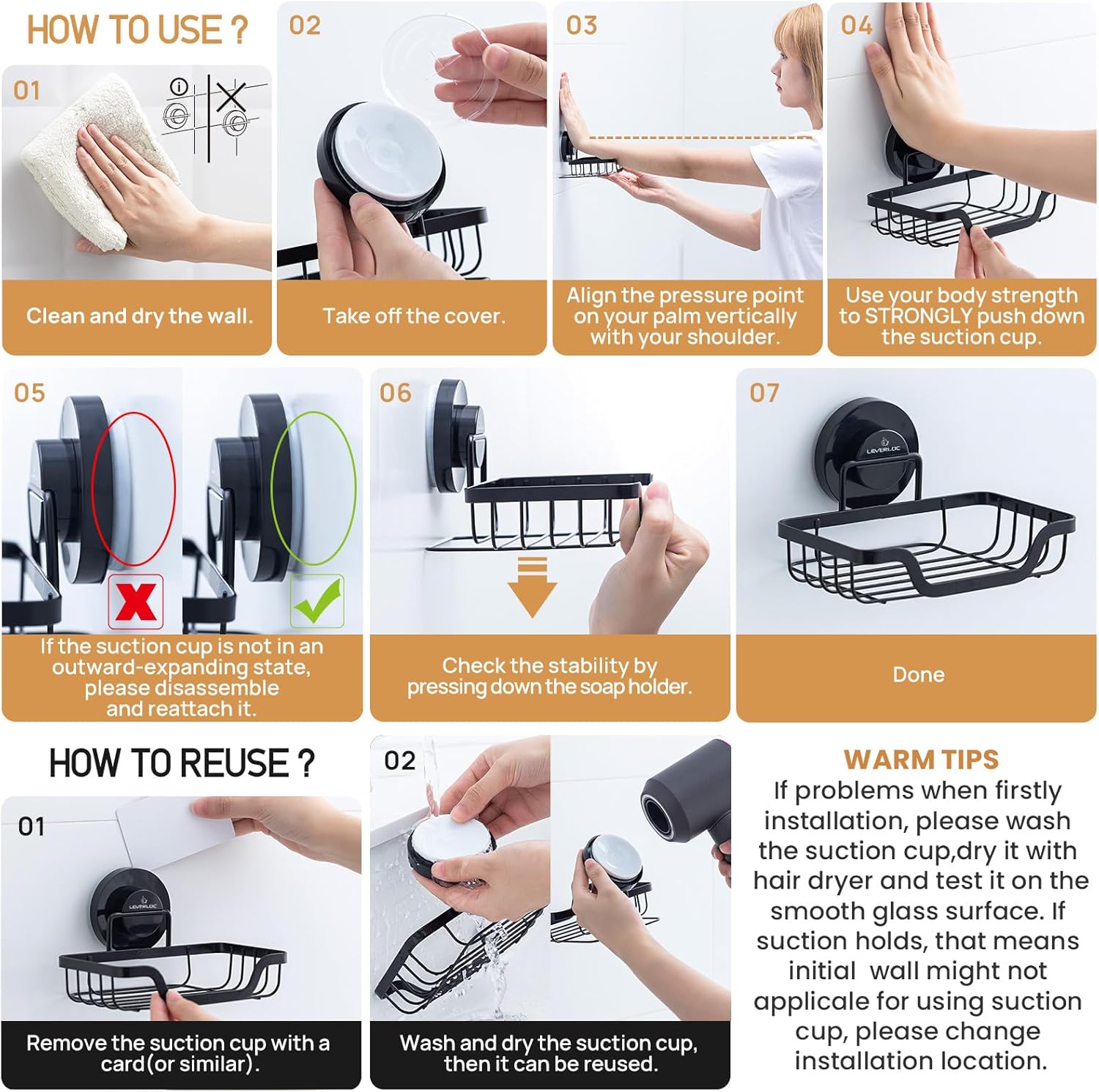 • PATENTED PRODUCT & SUPER SUCTION POWER: Suction cup with patent bionic design of octopus tentacles have powerful suction and superior durability. It is waterproof and oilproof. The suction cup soap dish for shower wall can hold up to 11 LBS, is so stable and durable