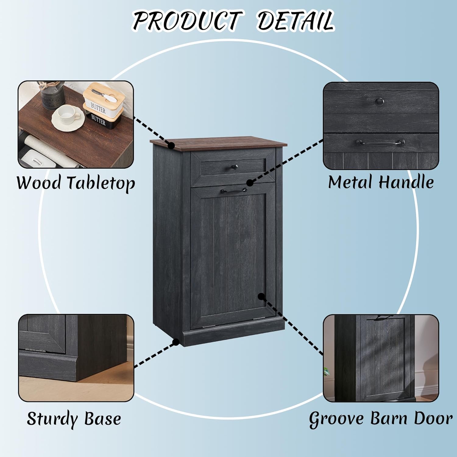 • 【Farmhouse Furniture】This wooden trash can cabinet features a simple streamlined design that combines farmhouse, beauty and practicality, easily blending into a space with a rustic farmhouse atmosphere.