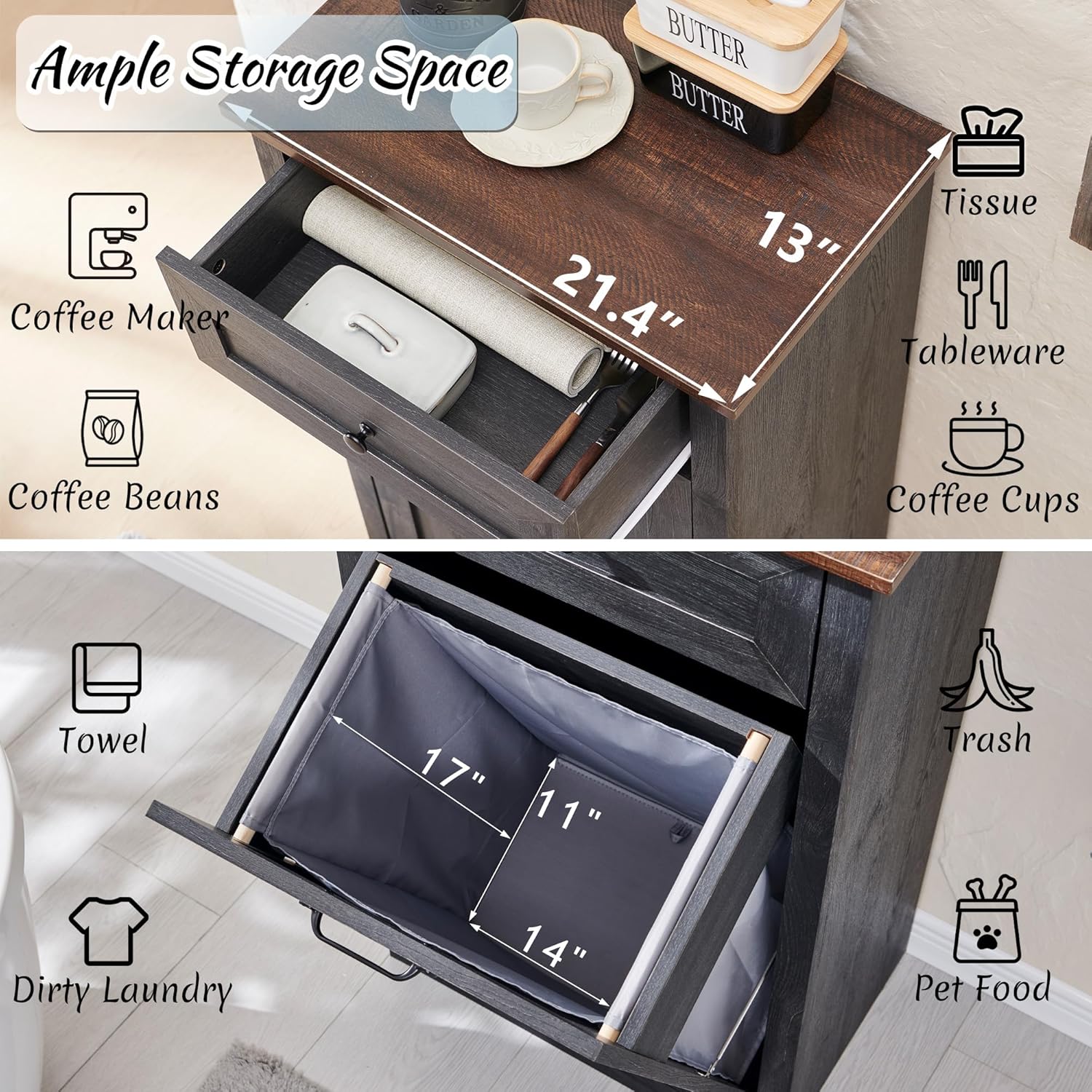 • 【Tilt Out Laundry Hamper】Cabinet Dimensions: 13"D x 21.4"W x 35.8"H. Drawer Dimensions: 9.84"D x 17"W x 6.53"H. This laundry hamper cabinet holds a 10 gallon trash can. (Includes 1pc laundry basket.)