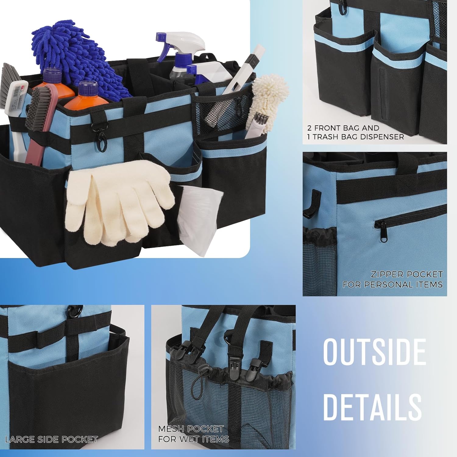 Wearable Cleaning Caddy, Cleaning Caddy Supplies Organizer with Handle & Shoulder Straps for Housekeepers, Under Sink & Car Cleaning Tool Organizers Bag with 4 Foldable Divider (Blue)