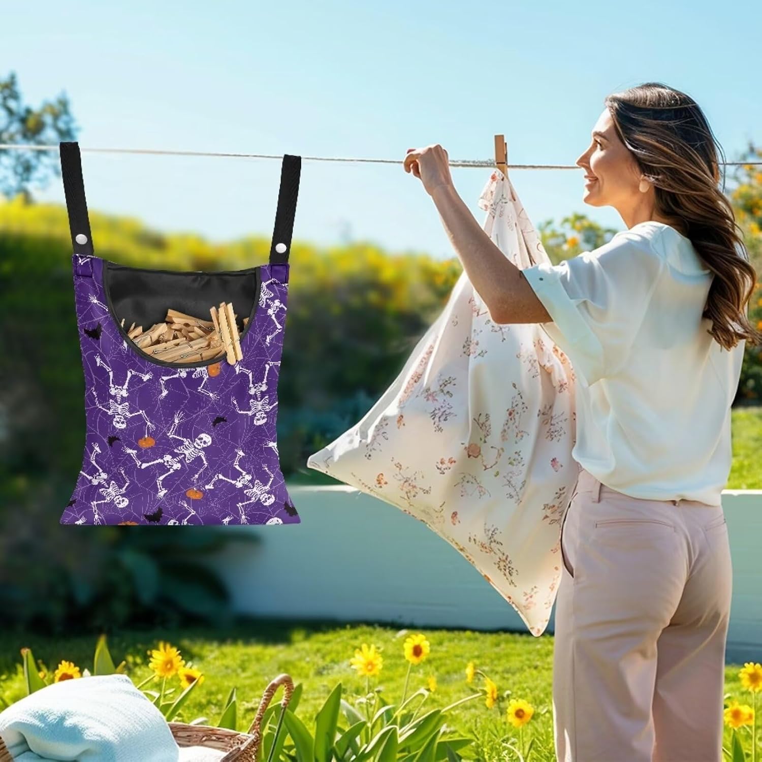Gothic Skull Summer Clothes Pin Bag Clothespin Bags Holder Clothespin Holder 14.5 x 12 Inch Clothespin Bag for Clothesline Outdoor Outside Laundry Room Reusable Clothespin Holder