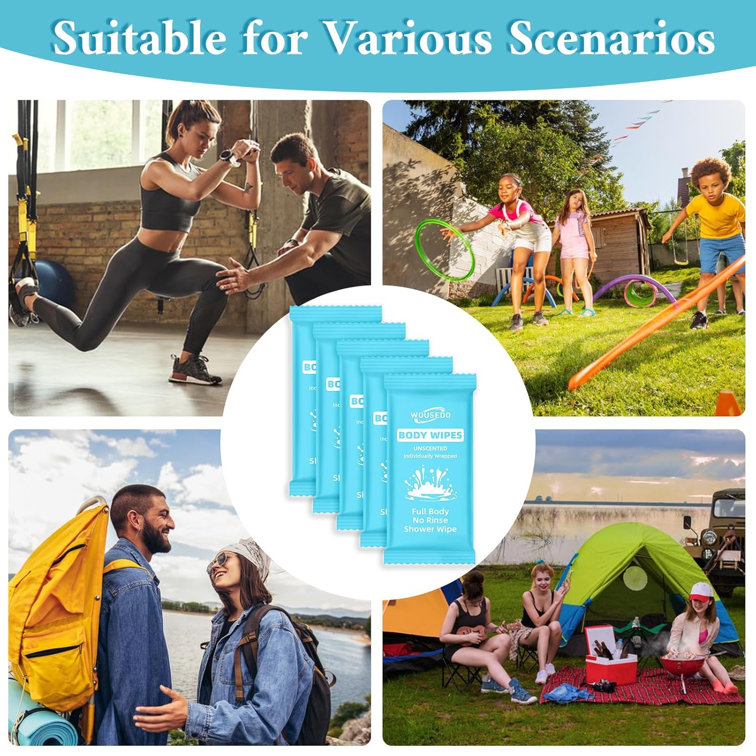 • Wide Applications: Our body wipes are suitable for all age groups and can be applied in a variety of scenarios. Whether you are traveling, camping, exercising, or just need a quick refreshment during the day, our shower wipes are always handy. They are a convenient and efficient cleaning solution that fits your active lifestyle, suitable for home, office, gym and other outdoor settings.