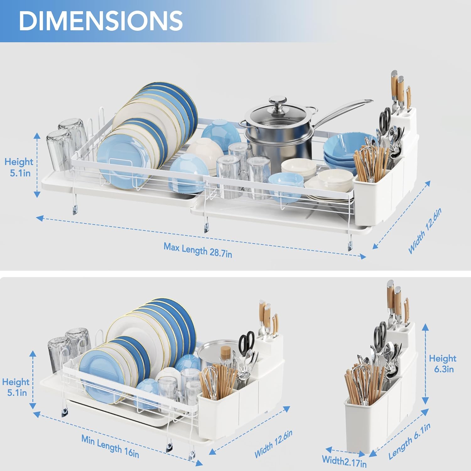 • Expandable Design:ROTTOGOON kitchen dish drying rack with an extendable design can be adjusted to fit different kitchens. It measures 12.6" W *5.1" H, and from 19.2" to 28.7" in length. This dish racks can accommodate plates, bowls, cups, glasses, and even full-sized pots and pans.Therefore, you can just adjust the extendable tray as you need.