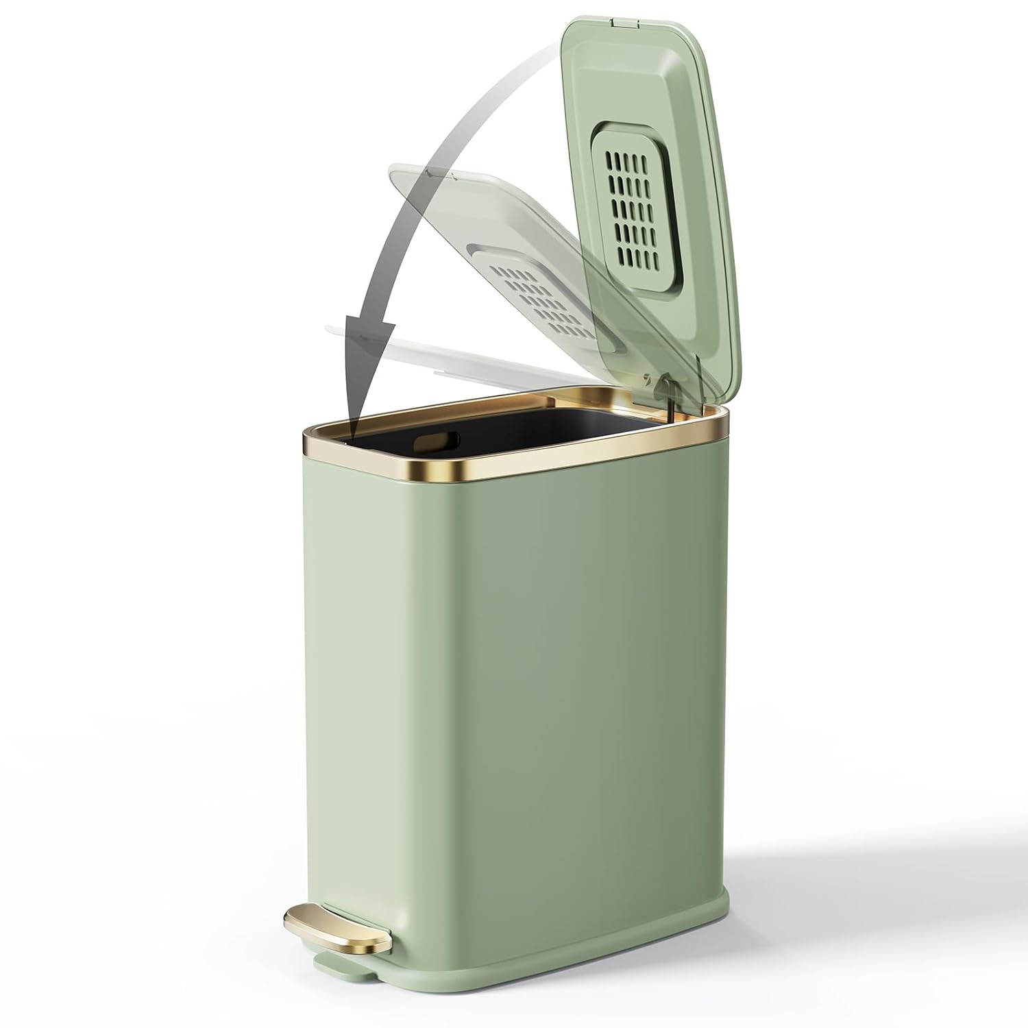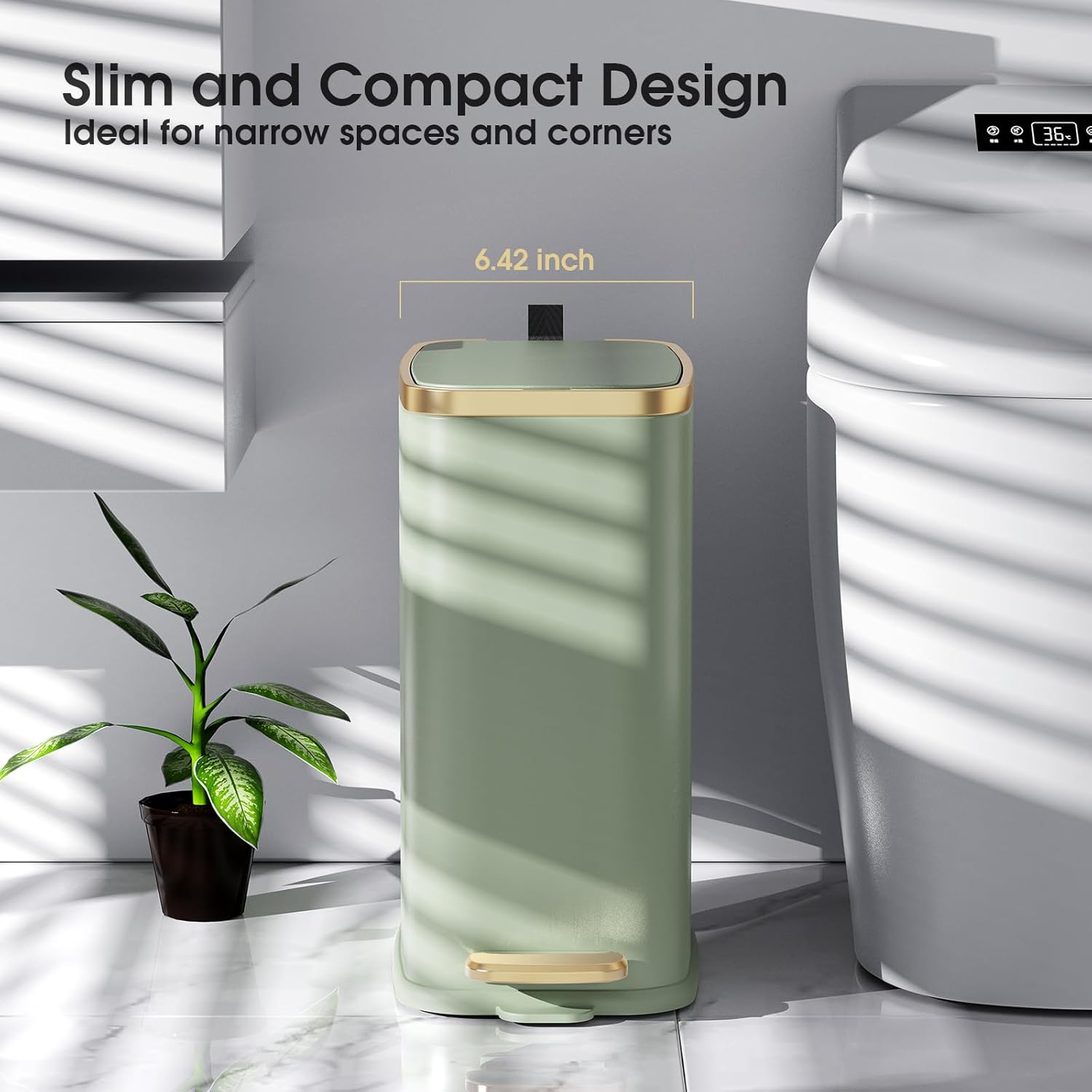 CEROELDA Small Bathroom Trash Can with Lid Soft Close-5L/1.3 Gal Slim Garbage Can-Metal Step Wastebasket-Rectangle Narrow Waste Bin for Office, Bedroom, Toilet, Live Room (Green)