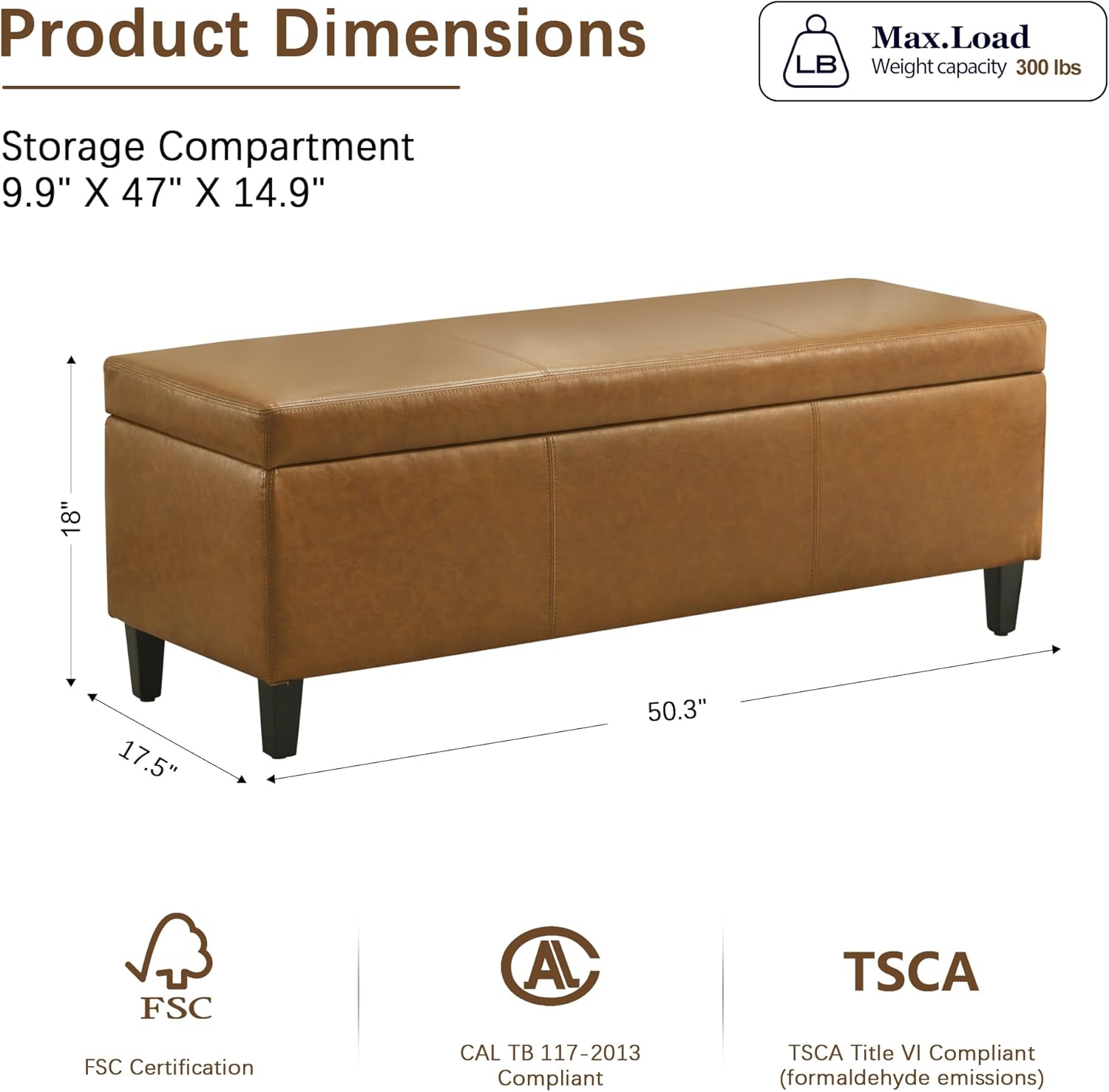 HUIMO Faux Leather Storage Ottoman Bench 50.3 Inch Extra Long PU Upholstered Bedroom Bench with Large Storage Space for The Living Room, Entryway, Bedroom Hold Up to 300lbs (Light Brown)