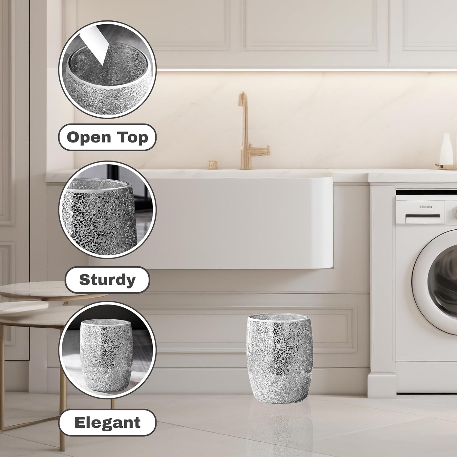 Escenzy Modern Bathroom Trash Can Silver Mosaic Glass 5L | 7" x 10" | Luxury Waste Basket for Restroom, Bedroom, Office & Kitchen | Decorative Small Garbage Can | Silver Glitter Bathroom Accessories