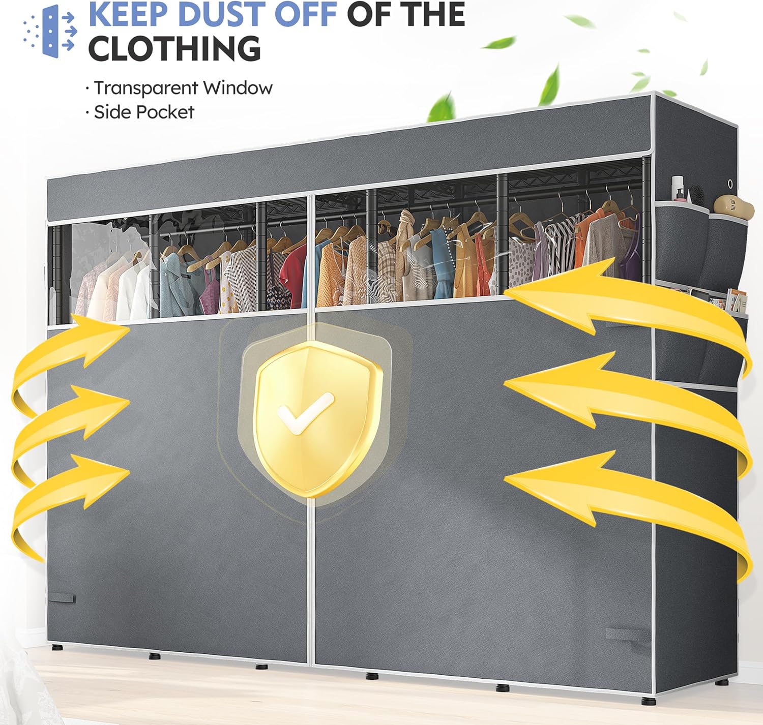 • 【Spacious Wardrobe Compartments】Clothing rack with 5 hanging rods perfect for hanging tops, coats, and sweaters. 8 storage shelves perfect for storage of items such as handbags, hats, quilt and storage box. Wardrobe can hold suitcases and large storage bins at the top, and shoes at the bottom. It adds more storage space for all clothes and accessories and makes home neatly organized