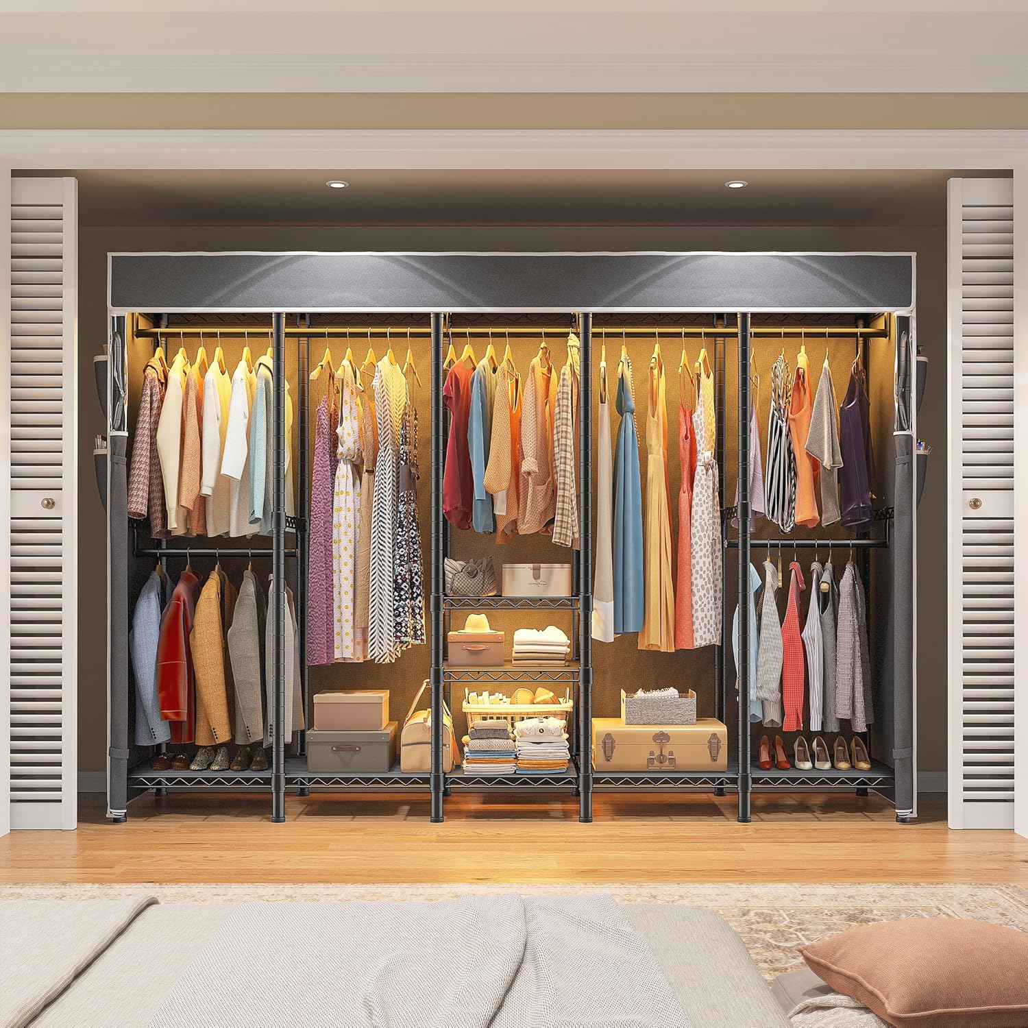 • 【Maximum Bearing Capacity 1200LBS】The clothes racks for hanging clothes takes excellent metal poles and sturdy metal wire, all metal parts are powder-coated which protects sturdy clothes rack from water and rust to makes it easy to clean and ensure years of use. Single hanging rod supports up to 70 lbs, each wire shelf supports up to 90 lbs. Stronger, not bending able to support heavier weights and it will meet long term storage needs. It's great for hanging suits, coats, long dresses, jackets, pants, shirts or other heavy clothes. Offer firm support for beautiful clothes in different seasons