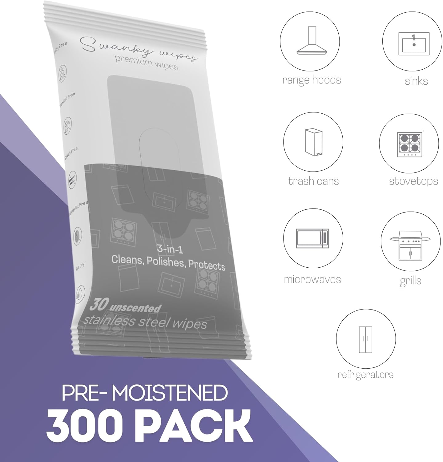 • PRODUCT SPECS - Swanky Stainless Steel Cleaning Wipes come in a pack of 300 soft, non-scratch wipes. Each wipe is pre-moistened and ready to use, making them a convenient addition to your cleaning supplies. Ideal for keeping your stainless steel appliances looking polished and clean.