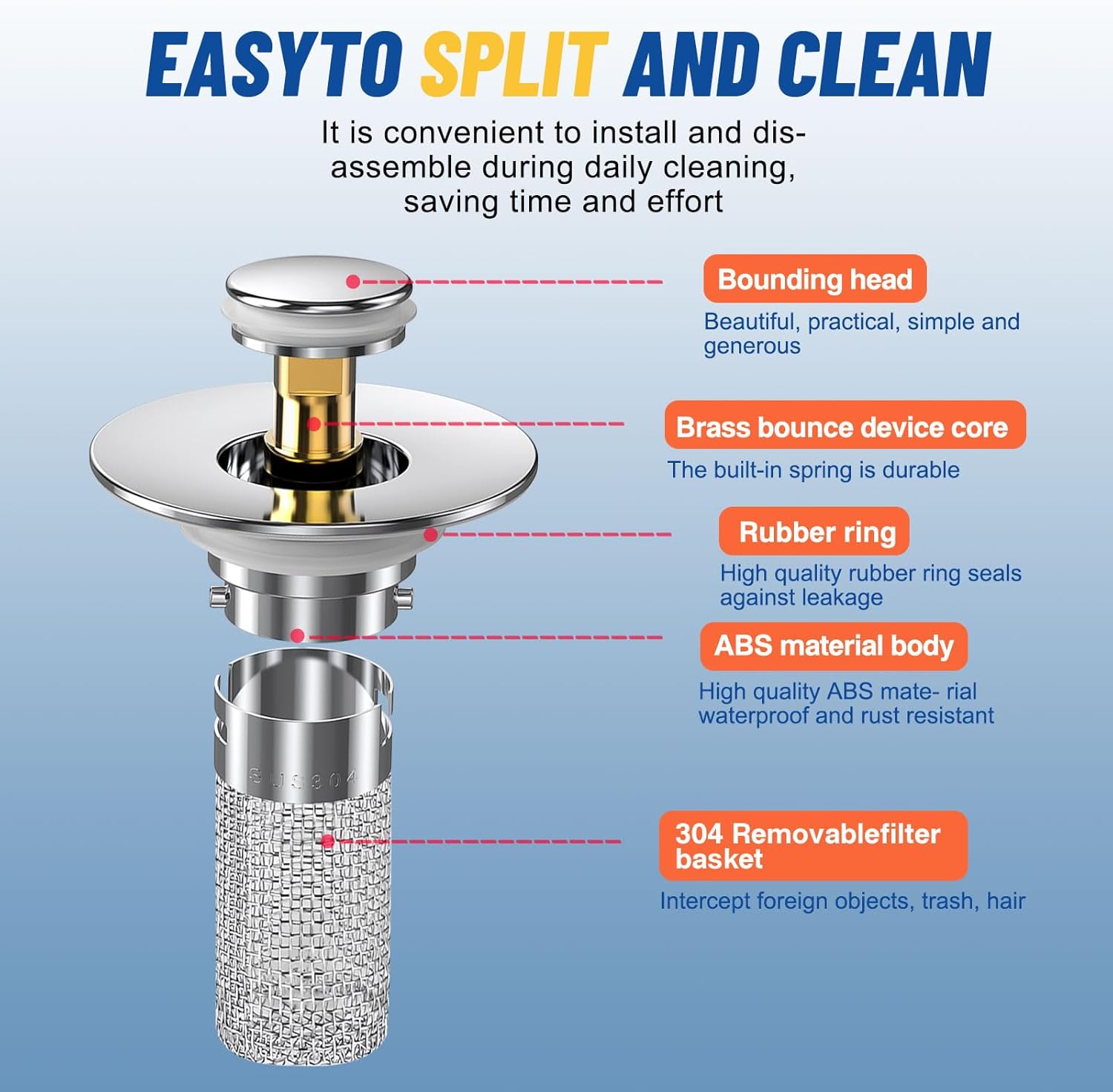 • 【PRACTICAL AND EFFICIENT】This sink stopper is a practical choice for any bathroom sink. Its efficient drainage and anti-clogging capabilities ensure a smooth flow of water, Say goodbye to clogged sinks,make it a reliable and low-maintenance solution for bathroom sinks.