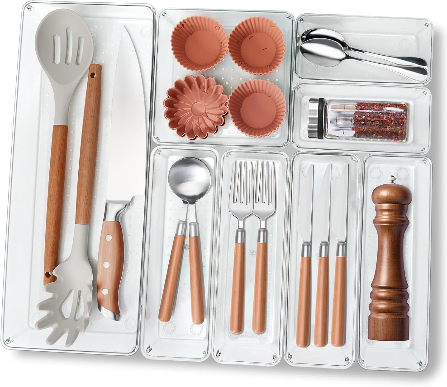 Criusia Utensil Drawer Organizer for Kitchen, 8 Pack Silverware Organizer Utensil Holder, Clear Plastic Drawer Dividers for Flatware, Cutlery, Kitchen Gadgets Accessories, Organizador de Cocina