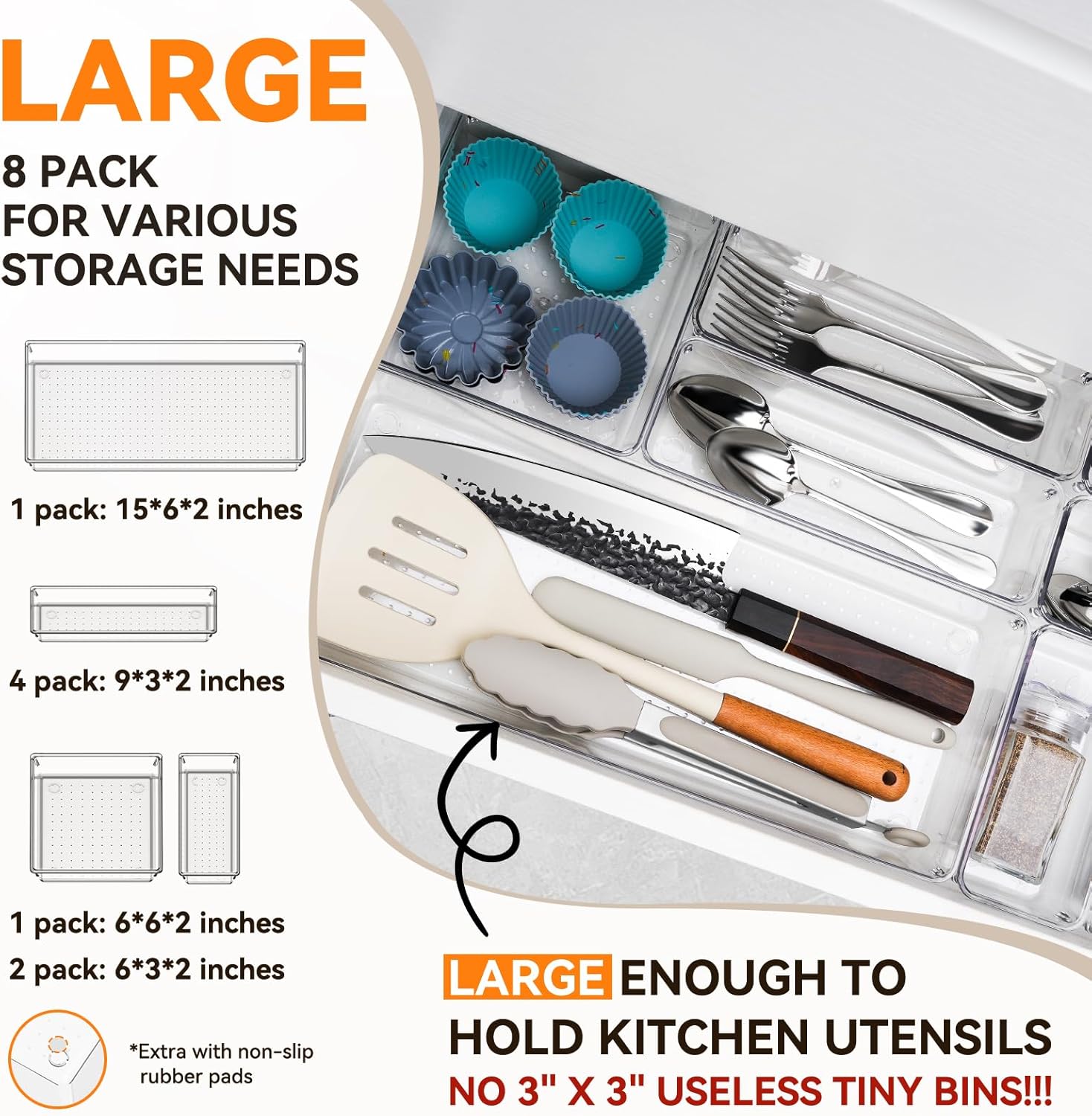 • γ€π™‡π˜Όπ™π™‚π™€ π™Žπ™„π™•π™€ π™π™Šπ™ π™ˆπ™Šπ™π™€ π™Šπ™‹π™π™„π™Šπ™‰π™Žγ€‘With 4 sizes from extra large to small, this 8 set desk drawer organizer could meet all drawer organization and storage needs for kitchen utensils, silverware, kitchen gadgets, bathroom essentials, makeup accessoires or office supplies. Includes: 1pcs 15x6x2 inches, 1 pack 6x6x2, 2 pack 6x3x2, 4 pack 9*3x2.