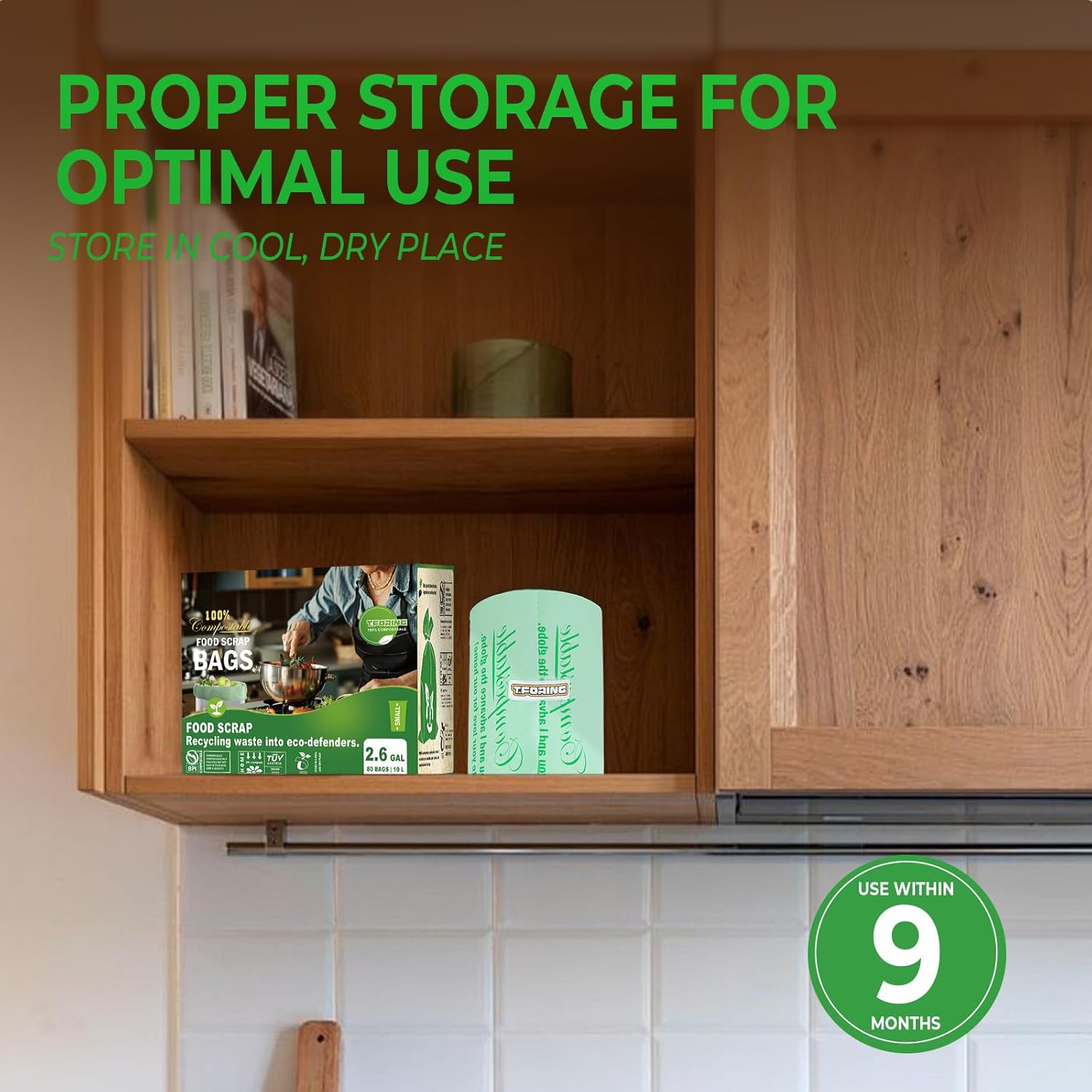 • 【2.6 Gallon Compost Bags】Just the right size to perfectly fit most small trash cans. The 2.6 gallon trash bags are 16.3” W x 16.5''H,0.8 Mil Thick,suitable for 9-12L Countertop Bin. 80 Bags Per Roll.
