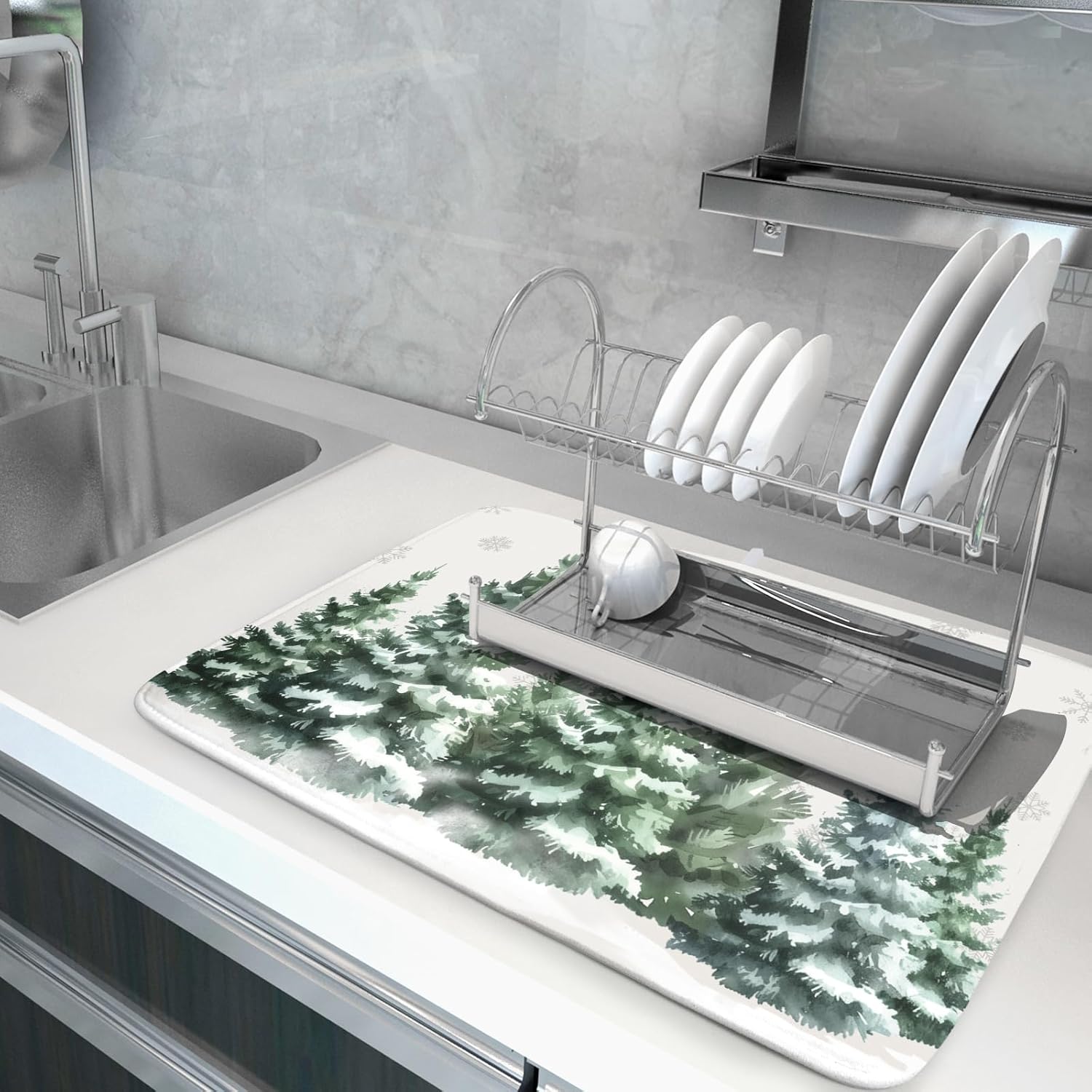 • 【Dish drying mat】The winter pine tree dish drying mat is 16x18inch/18x24inch, which is suitable for most homes and kitchen countertops while providing a smart and sharp look. Our dish drying mat is soft and durable, can be used as a drying mat, put down all sizes of kitchen tableware, also can be used as a protective pad, dish mat, cup mat, heat insulation pad for countertop for heat insulation and ironing, which can perfect hold your dishes, plates, big pots and pans.